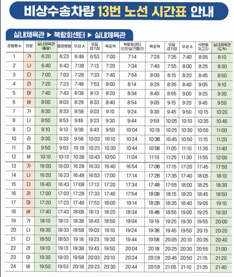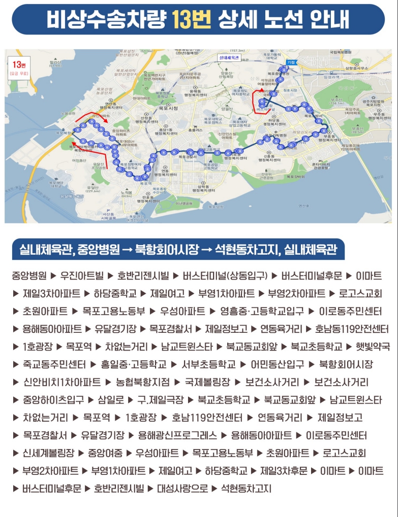 13번 버스는 실내체육관을 기점으로 북항회센터를 경유하며 터미널, 이마트, 하당중, 제일여고, 신흥동, 목포역, 목원동, 북학동을 주요 경유지로 하여 6대가 48회 운행예정입니다. (11월 7일 부터)