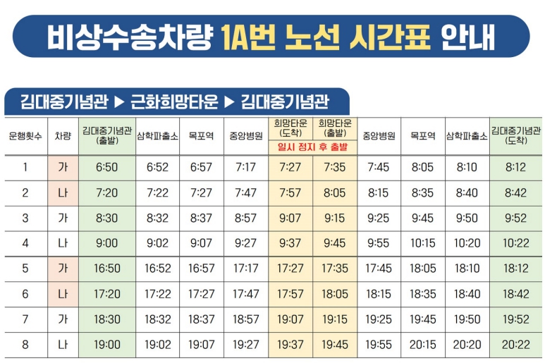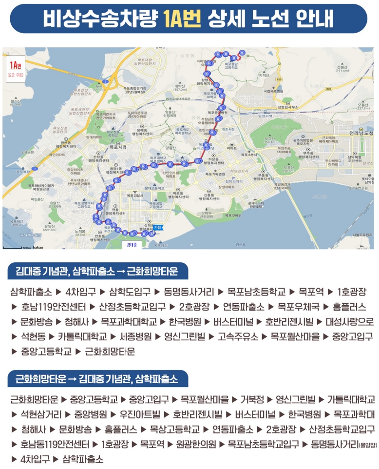 1A번 버스는 김대중 기념관, 삼학파출소글 기점으로 근화희망타운을 종점으로 하며 동명사거리, 목포역, 터미널, 중앙고, 근화희망타운을 주요 경유지로 하여 2대가 16회 운행예정입니다.(11월 7일 부터)