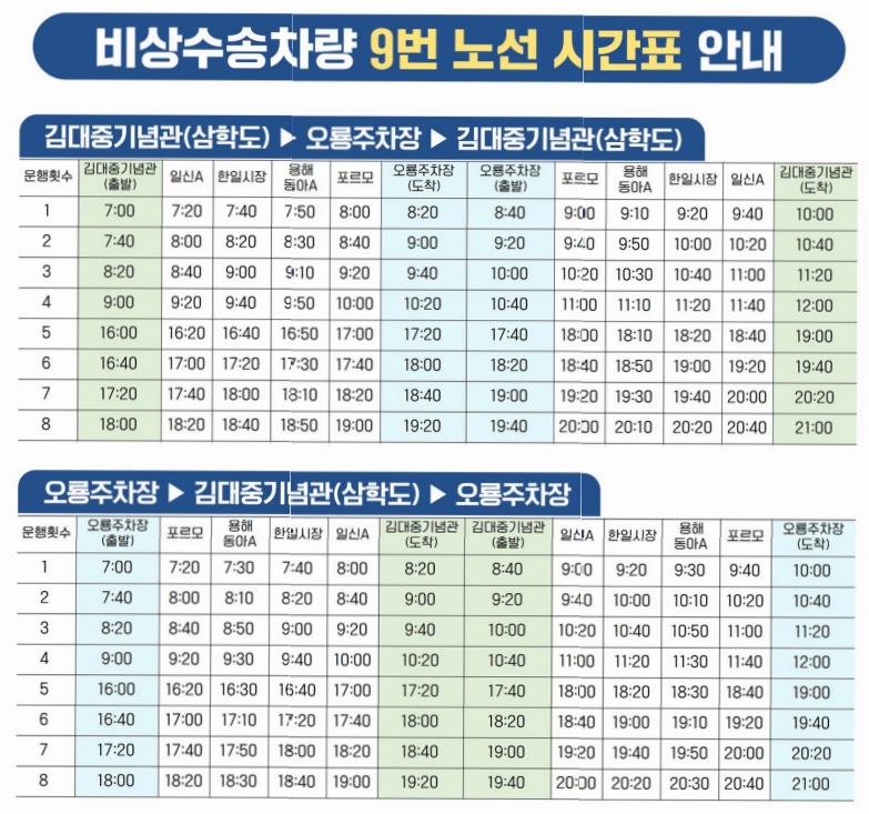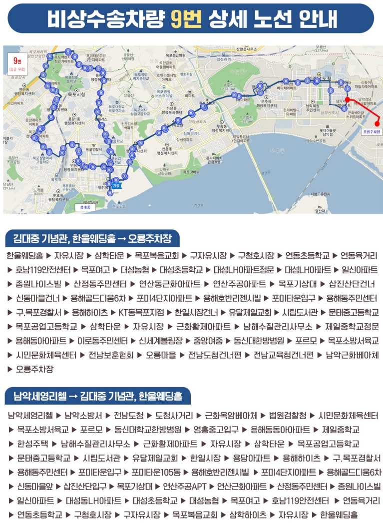 9번 버스는 김대중 기념관, 한울웨딩홀을 기점으로 오름주차장을 종점으로 하며 문태고, 3호광장, 용해지구, 대성동, 구청호시장, 영흥고, 부주동을 주요 경유지로 하여 8대가 32회 운행예정입니다.