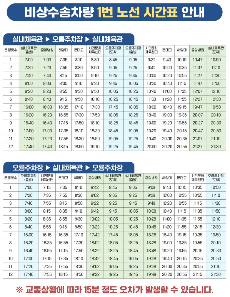 1번 버스는 실내체육관, 오름주차장, 실내체육관을 종점과 기점으로 하며 터미널, 목포역, 해양대, 홍일고, 동부시장, 문태고, 영흥고, 부주동을 주요 정차로 하며 총 12대가 48회를 운행하며 노선도는 참고하시기 바랍니다.
