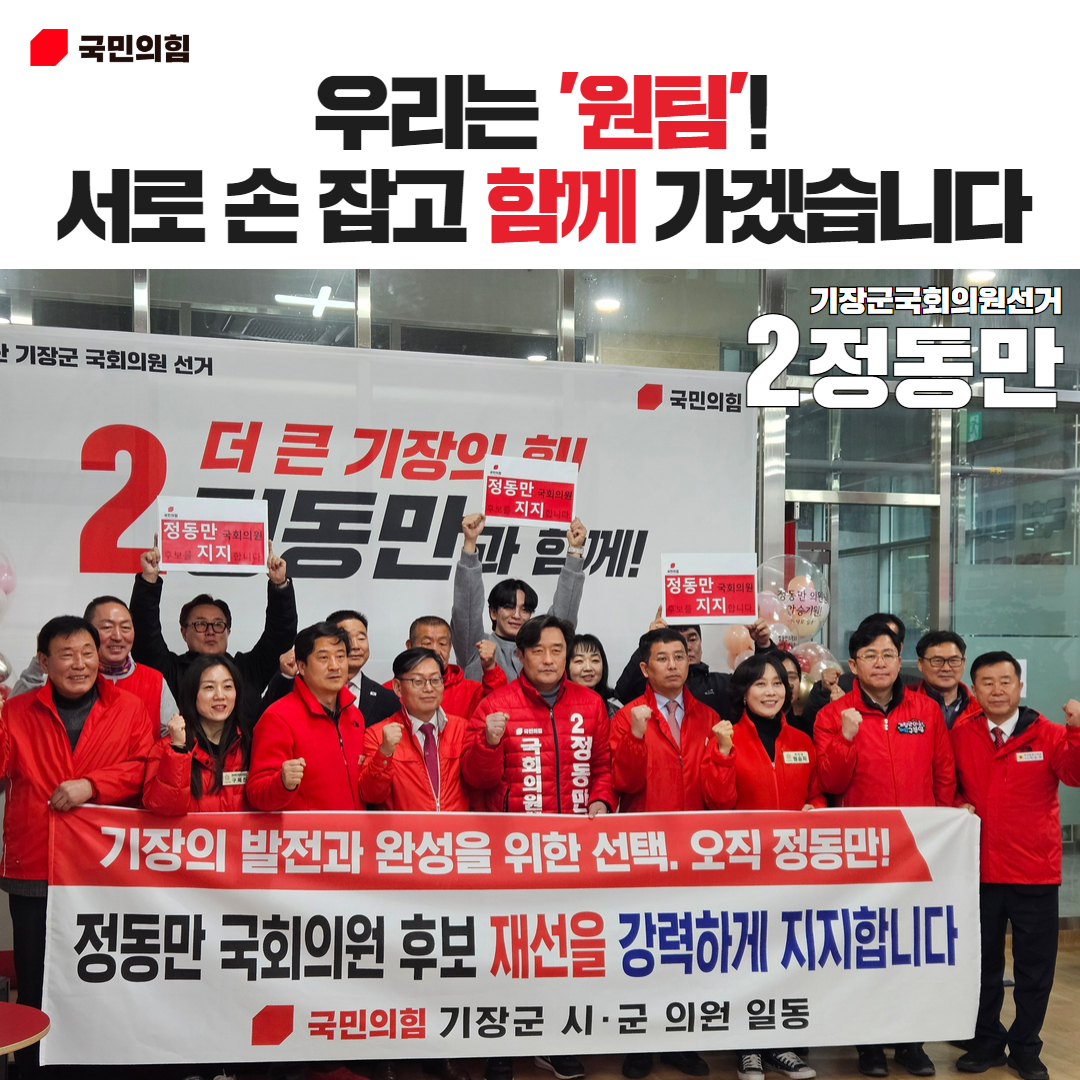 그는 "윤석열 정부의 주요 정책과 ‘정관선 건설’ 등 현재 진행 중인 주요 지역 현안들을 속도감 있게 추진하기 위해서는 여소야대 구도를 바꿀 수 있는 22대 총선승리가 절실하게 필요하다"면서 "정책과 예산을 경험한 힘 있는 재선의원으로서, 더 큰 기장과 대한민국의 발전을 위해 계속해서 헌신해 나가겠다"고 말했습니다.