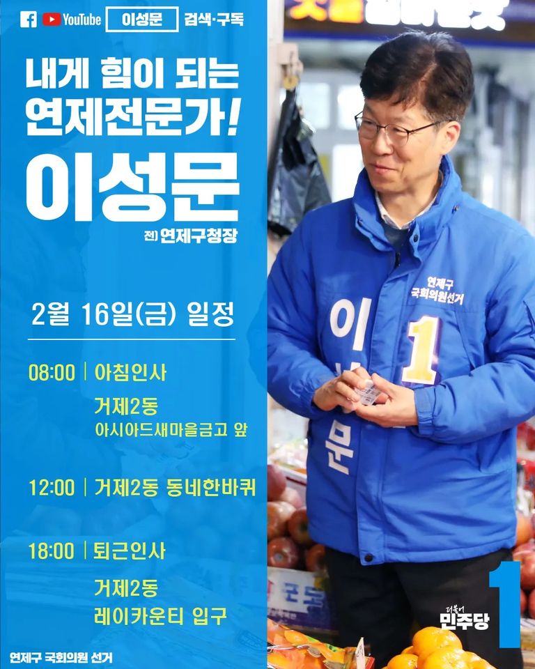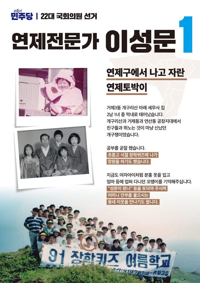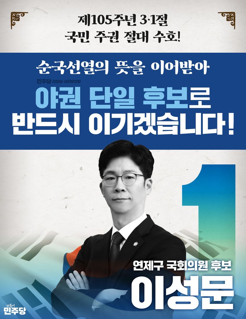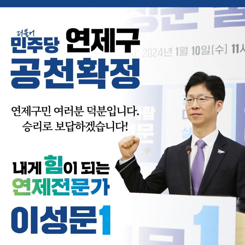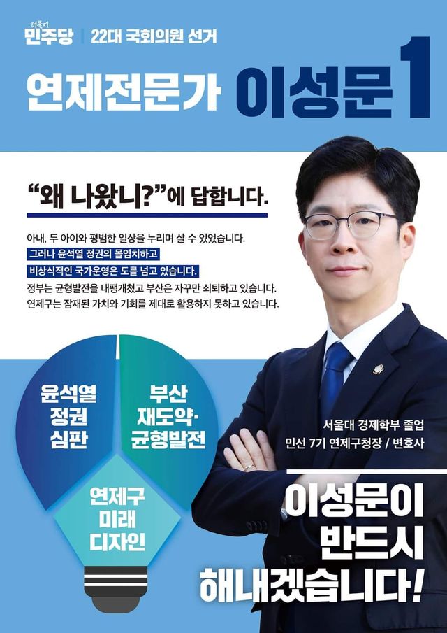 이성문 후보는 “두 아이를 키우며 변호사 일을 하고 평범한 일상을 누리며 살 수 있었으나 우리 대한민국과 부산 그리고 연제구가 처한 현실을 가만히 지켜보고 있을 수만은 없었다”면서 “부산은 갈수록 쇠퇴해 가고 있고, 연제구 역시 가지고 있는 기회요인을 제대로 발현하지 못하고 있기 때문에 정치가 제 역할을 해야한다고 생각한다.” 라고 말했습니다
