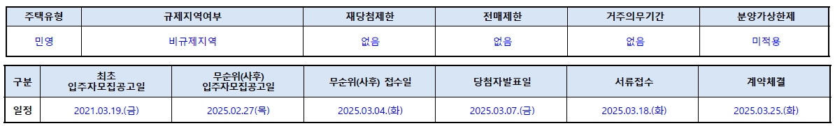 입주 예정 시기는 2025년 3월이며, 계약 체결 후 계약금 및 잔금 완납 시 입주할 수 있습니다. 이 아파트는 주택재개발정비사업으로 공급되며, 최초 입주자 모집 시 1순위 및 2순위 청약 마감이 되었던 인기 단지입니다. 그만큼 이번 무순위 청약에서도 치열한 경쟁이 예상되니 꼼꼼히 준비해야겠죠!