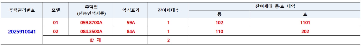 북수원자이렉스비아는 경기도 수원시 장안구 정자동에 위치한 대단지 아파트로, 지하 2층~지상 29층, 21개 동, 총 2,607세대 규모입니다. 이번에 나오는 무순위 청약 대상은 잔여세대 2세대로, 59A 타입 1세대(102동 1101호)와 84A 타입 1세대(110동 202호)입니다.