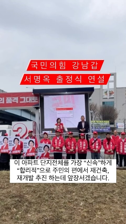 서명옥 후보는 강남구 보건소장과 한국공공조직은행장을 역임하며 공공의료 분야에서 활동해왔으며, 강남구의 재도약을 위한 주요 공약으로 재건축·재개발 신속 추진, 종합부동산세·상속증여세·재산세율 조정, 영동대로 통합개발 지원, 강남형 친환경 스마트 도시인프라 구축 등을 제시하였습니다. 또한, 코로나19 대응을 위한 봉사 의사로서의 활동도 인정받고 있습니다.