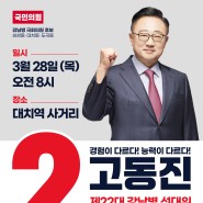 고동진 후보는 "강남은 대한민국의 경제중심지이자 초국가적 거점도시"라며 "강남의 발전이 곧 대한민국의 발전이라는 막중한 책임감으로 일하겠다"고 포부를 밝혔습니다. 그는 "집권 여당의 힘 있는 후보로 본선에서 승리해 야당의 무책임한 선동을 막고 대한민국 발전을 이뤄내겠다"고 밝혔습니다. 한편, 고동진 후보는 현재 국민의힘 중앙선대위 부위원장, 국민의힘 강남병 조직위원장 등의 직책을 맡고 있습니다