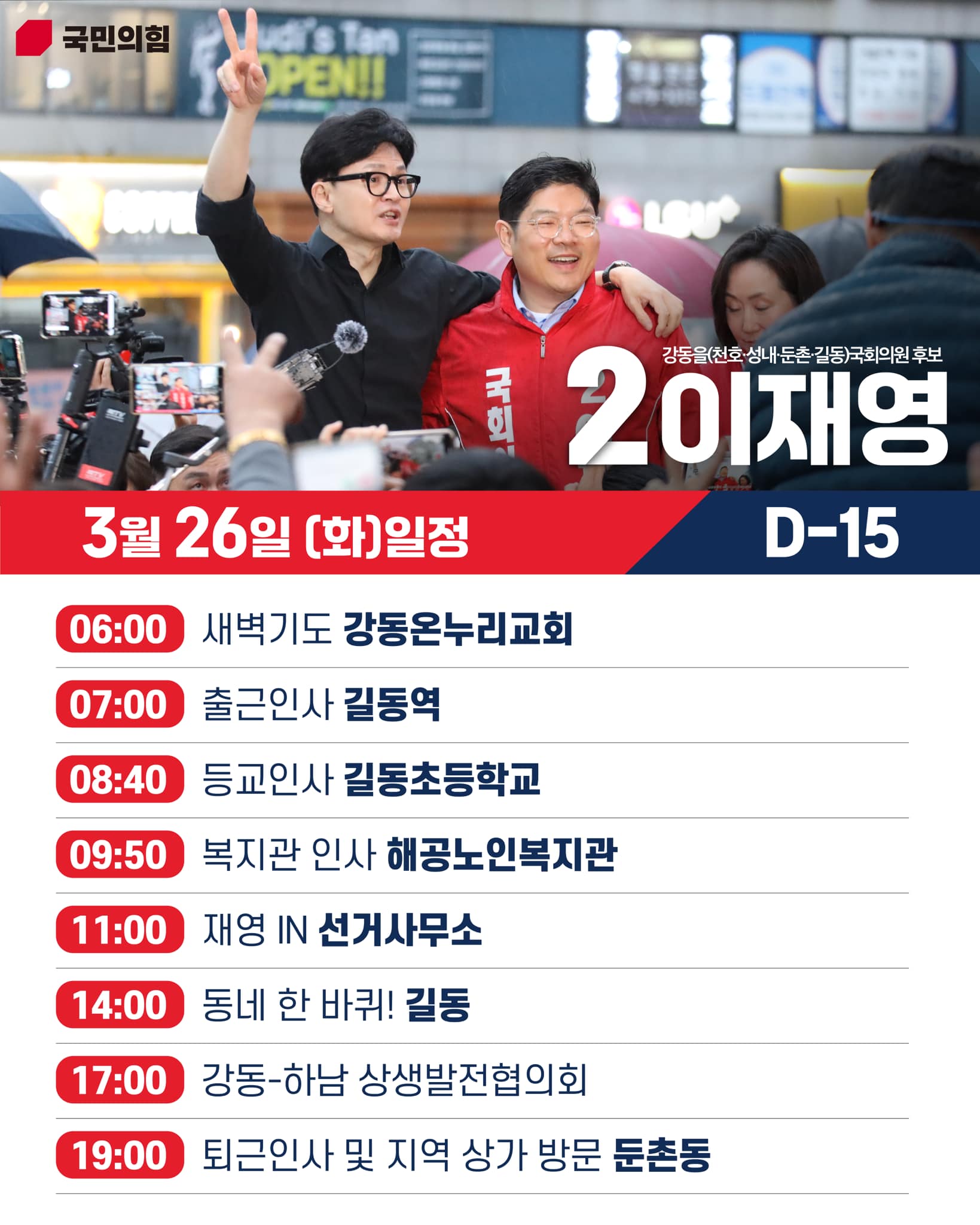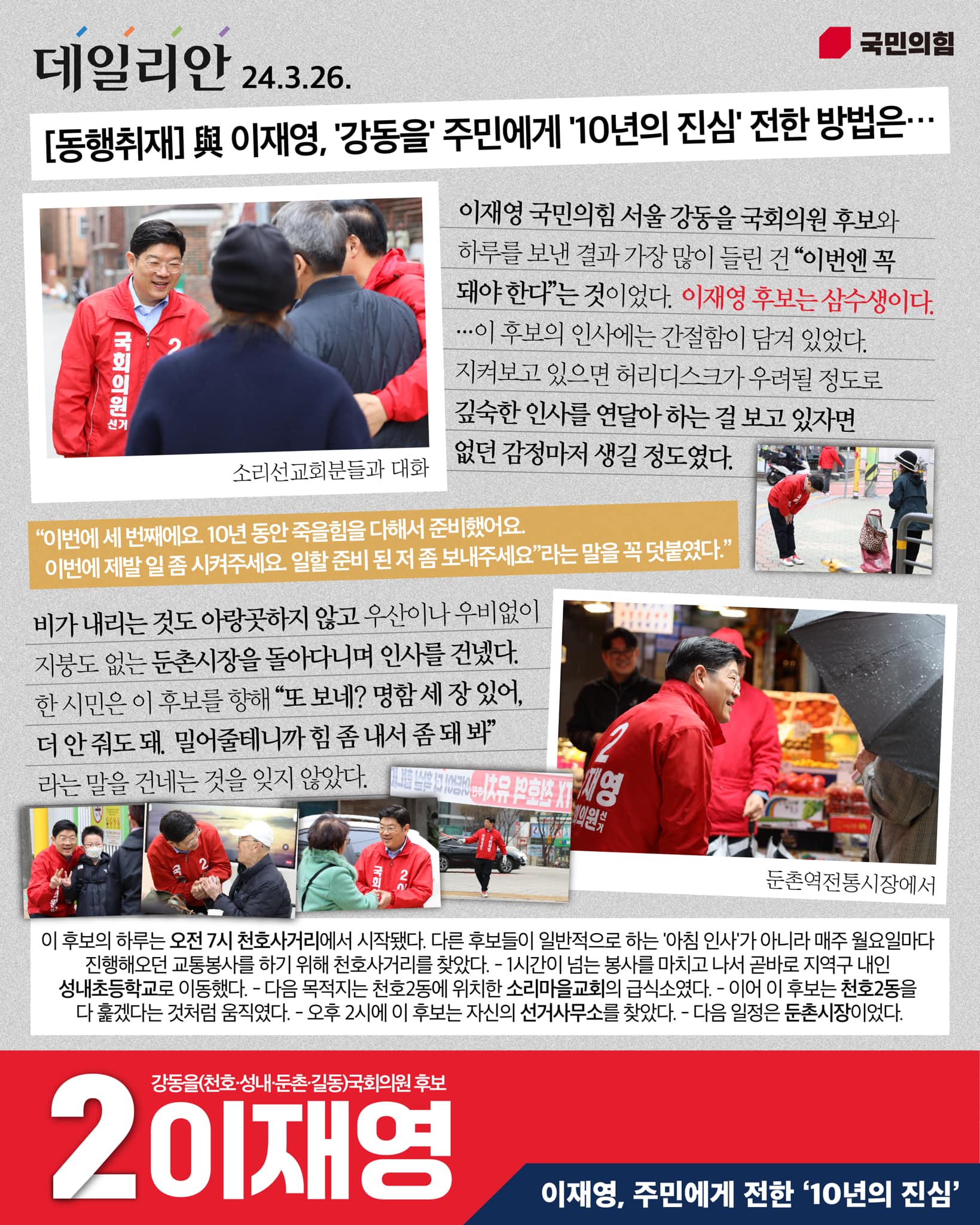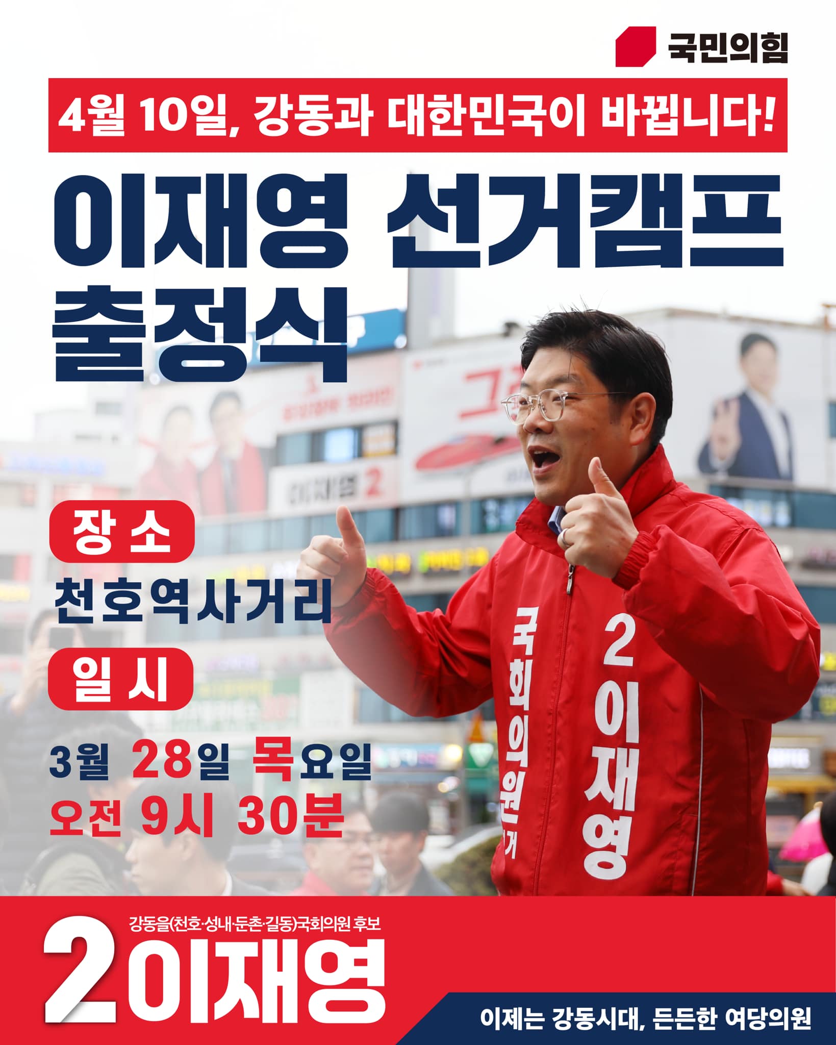 2014년부터 강동을 당협위원장을 맡아 10년 가까이 지역을 살폈다고 합니다. 그는 2024년 1월 10일에 예비후보 등록을 마쳤고, 2월 14일에 공식적으로 후보로 확정되었습니다. 이재영 후보는 국민의힘 제20대 대통령 선거 윤석열 대통령 후보 직속 총괄특보단 공보특보(외신담당) 및 국민의힘 국제위원장으로도 활동하였습니다.