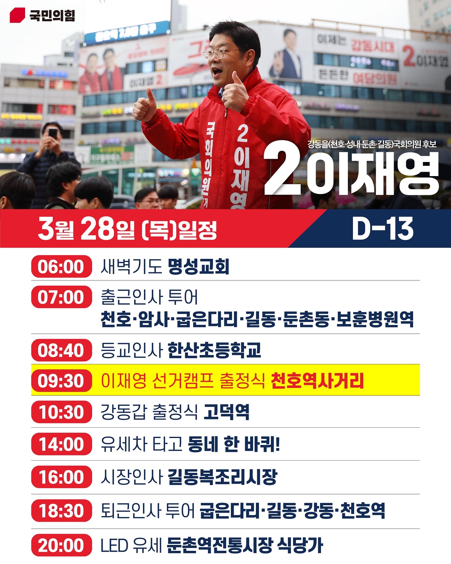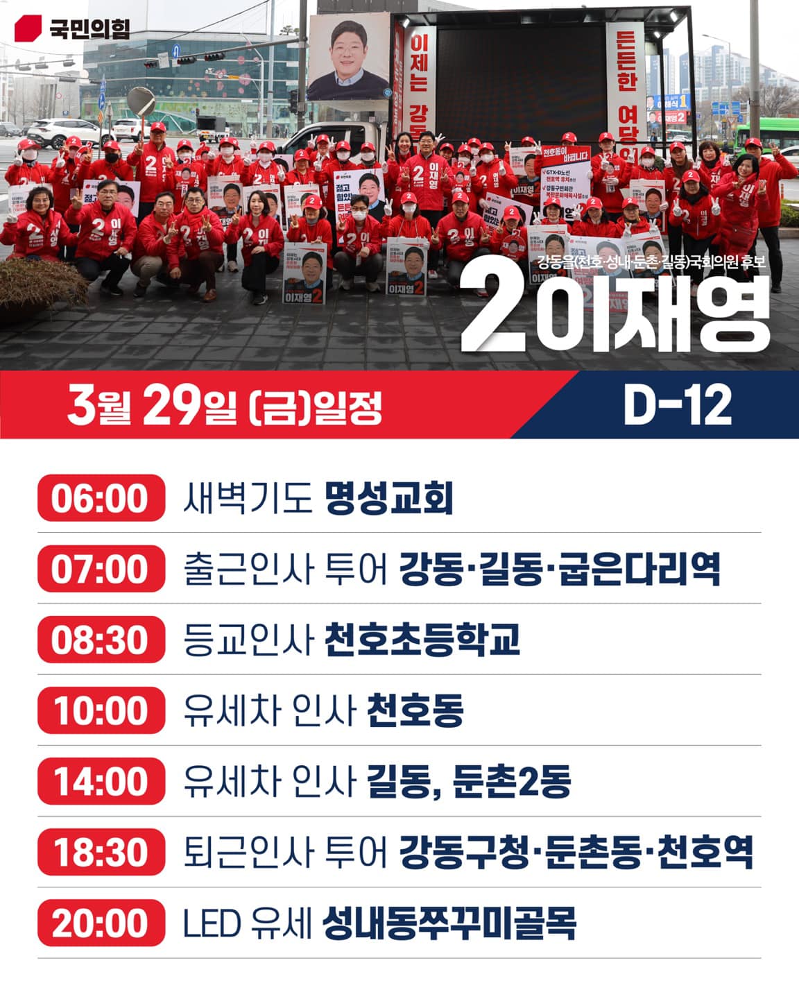 2014년부터 강동을 당협위원장을 맡아 10년 가까이 지역을 살폈다고 합니다. 그는 2024110일에 예비후보 등록을 마쳤고, 214일에 공식적으로 후보로 확정되었습니다. 이재영 후보는 국민의힘 제20대 대통령 선거 윤석열 대통령 후보 직속 총괄특보단 공보특보(외신담당) 및 국민의힘 국제위원장으로도 활동하였습니다.