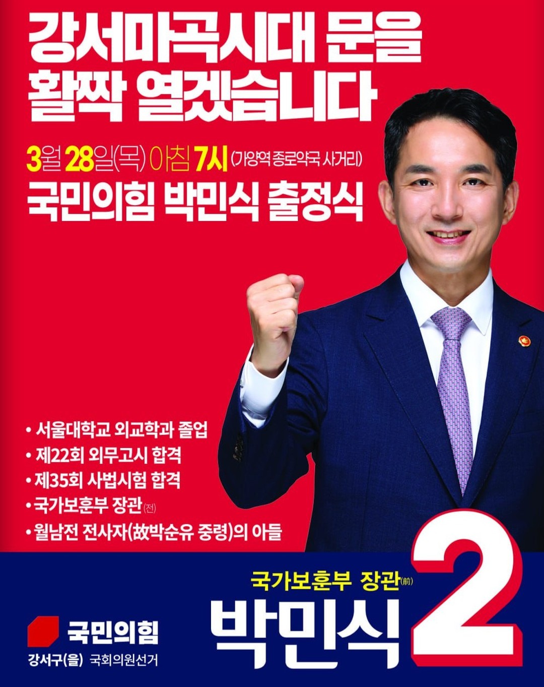 박민식 후보는 2024321일 제22대 국회의원 선거 서울 강서구 () 후보로 등록하였습니다. 그는 "410일은 신강서, 강서마곡시대의 문을 활짝 여는 출발점이 될 것"이라며 "공항동·방화1~3·등촌 3·가양1~2동 주민 여러분을 겸손하게 섬기며, 강력한 추진력으로 강서발전을 견인하겠다"라고 말하였습니다.