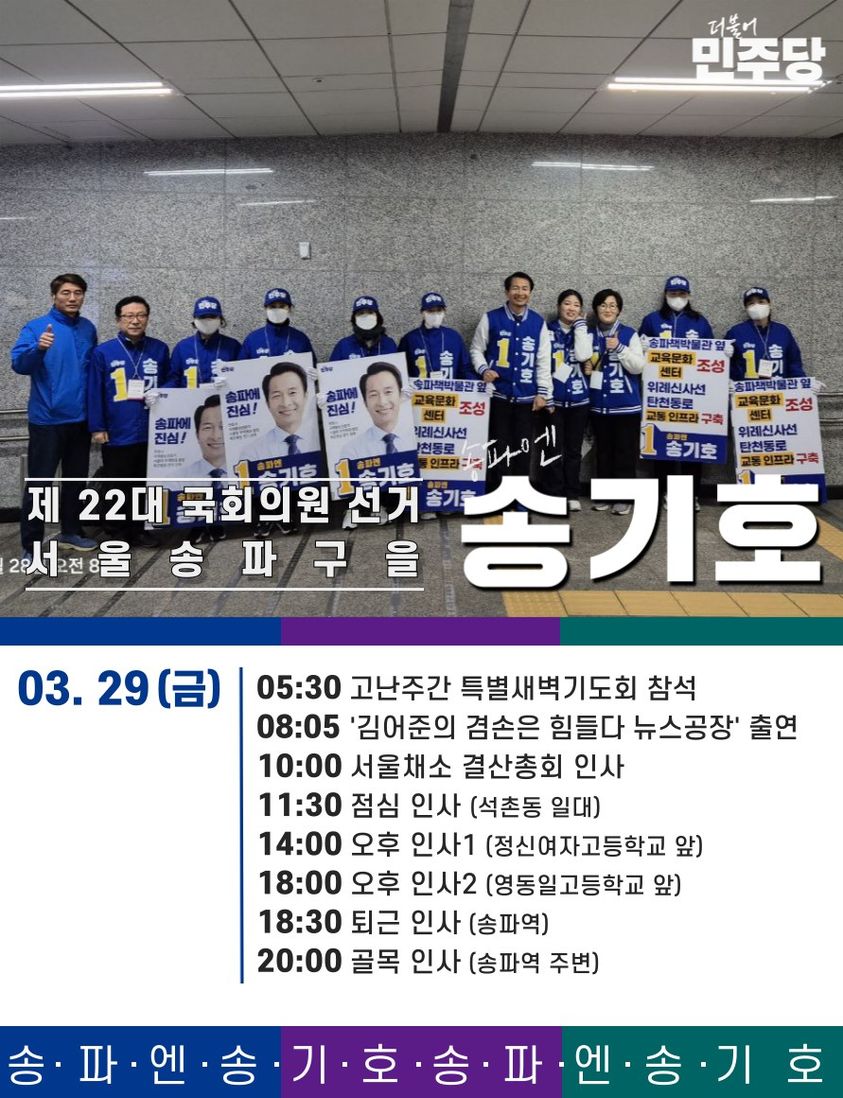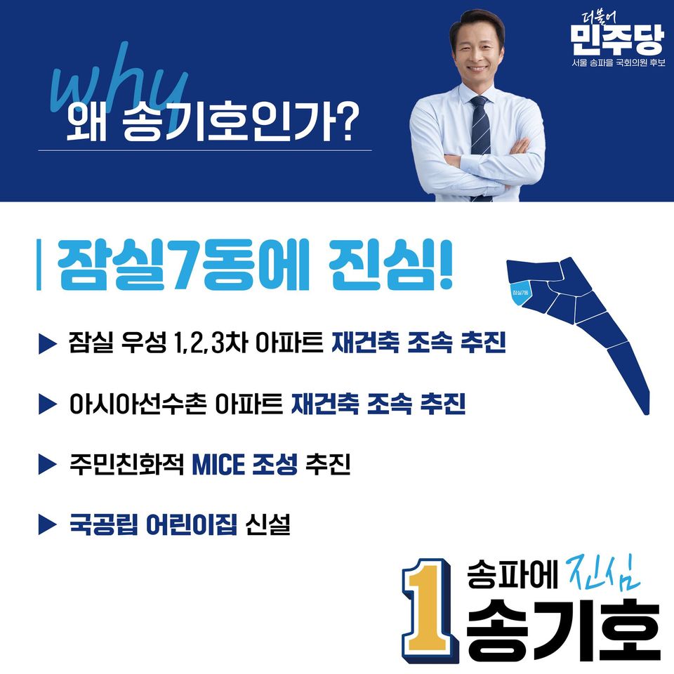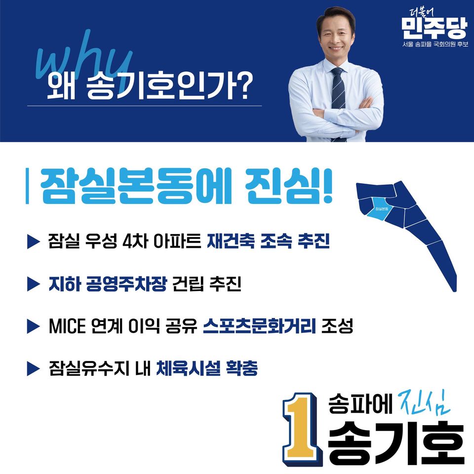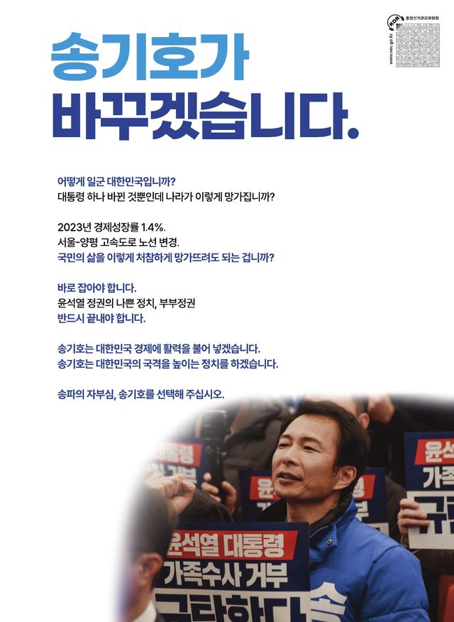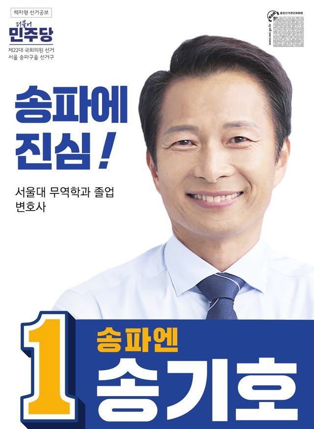 송기호 후보는 이 지역에서 30년 가까이 살아온 사람으로서 이곳 시민들이 정치의 주인이 될 수 있는 환경을 만들고자 합니다. 송기호 후보는 지난달 21일 여의도 중앙당사에서 발표된 1차 경선지역 개표에서 박지현 전 비상대책위원장을 꺾고 최종 본선행을 확정하였습니다. 그는 이번 4·10 총선에서 현역인 배현진 국민의힘 의원과 맞붙어 지역구 탈환에 도전하고 있습니다.