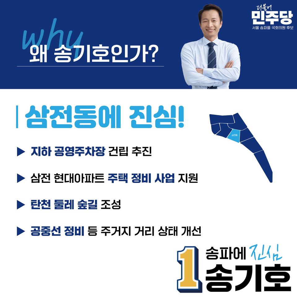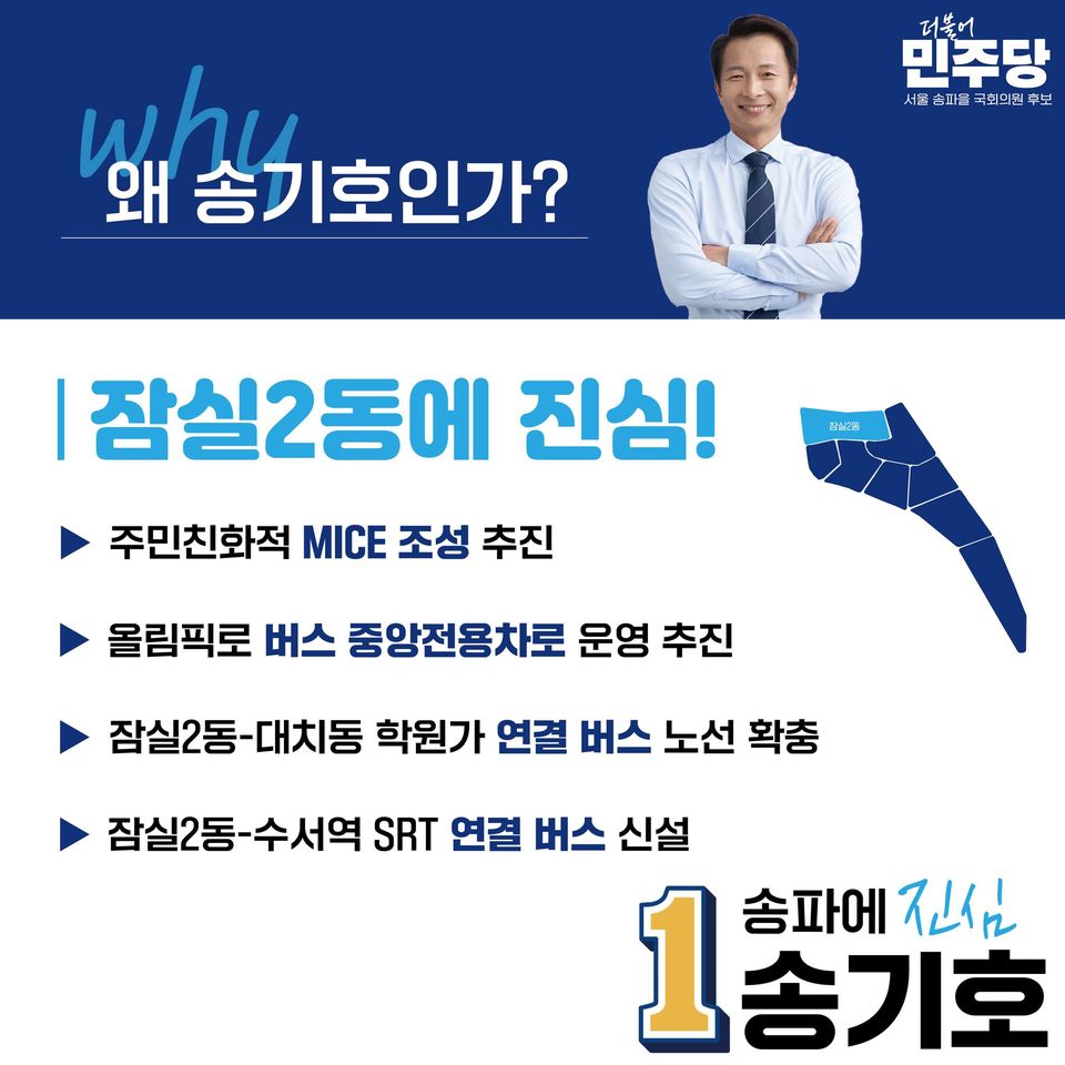 송기호 후보는 30년 가까이 송파에 거주한 연고를 내세우며, 생활에서 나오는 정치를 할 수 있다고 자부하였습니다. 그는 송파을이 단순히 '강남에 가까운 주거 단지’라는 개념을 넘어 '고유한 부가가치를 생산하는 연구 단지’가 될 수 있도록 해야 한다고 본다. 관련한 제 장기적 구상을 꾸준히 주민들과 공유하며 소통하고 있기도 하다.