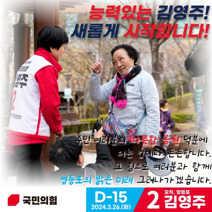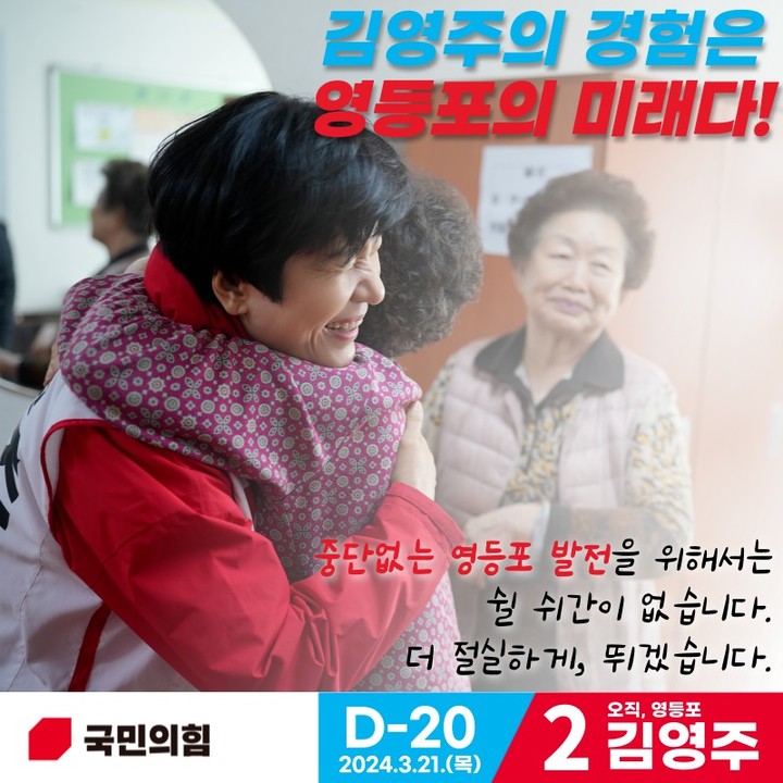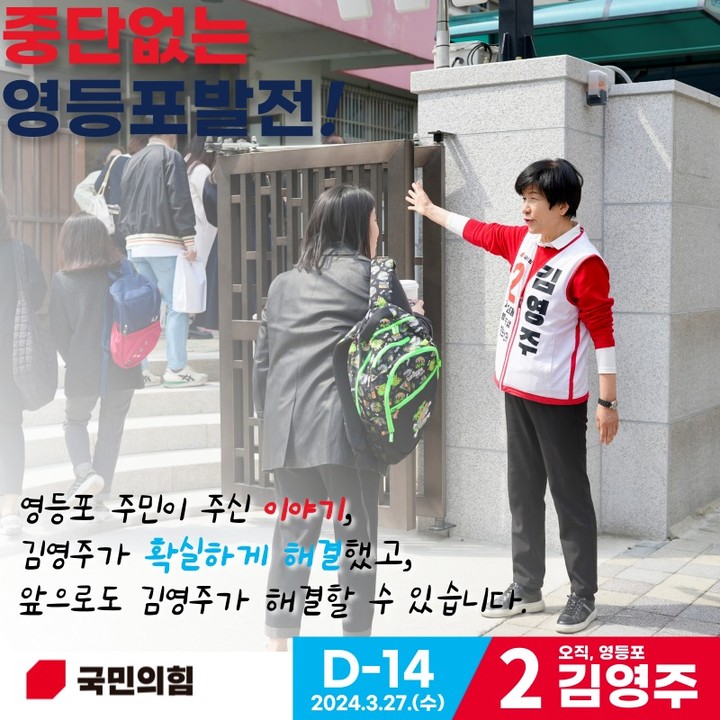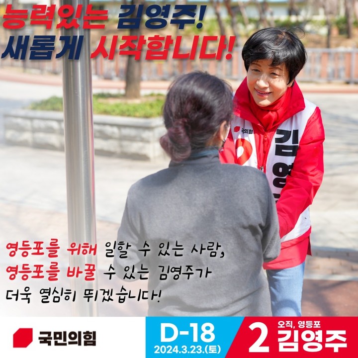 김영주 후보는 국민의힘 서울 영등포갑 후보로 제22대 총선에 출마하였습니다. 그녀는 민주당을 탈당한 후 국민의힘에 입당하였습니다. 김 후보는 "정치인은 국가 발전과 삶의 질 향상을 위해 일을 해야 한다. 사리사욕의 도구로 쓰여서는 안 된다"라고 말하였습니다. 이는 국민의힘의 기본적인 가치인 국가적 위기 해결에 앞장서야 할 정치가 국민이 부여한 권한에 대한 책임과 역할을 다해야 하며, 사회적 혼란과 함께 정치 불신을 심화시키는 것을 방지해야 한다는 원칙과 일치합니다.