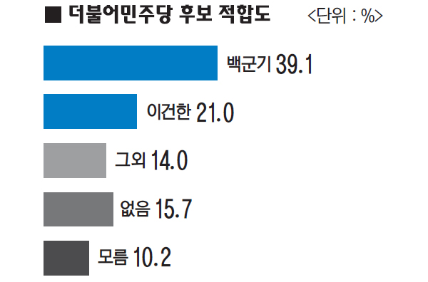 경선을 치르고 있는 상태에서 발표된 더불어민주당 적합도 조사에서는 백군기 현 용인시장이 39.1%로 이건한 전 용인시의회 21%를 크게 앞서고 있는 것으로 나타났습니다. 용인시장은 민선7기까지 재선을 한 역사가 없어 백군기 현 시장이 공천을 확정지으면 최초 재선시장이 될 수 있는 도전권을 획득하게 됩니다.