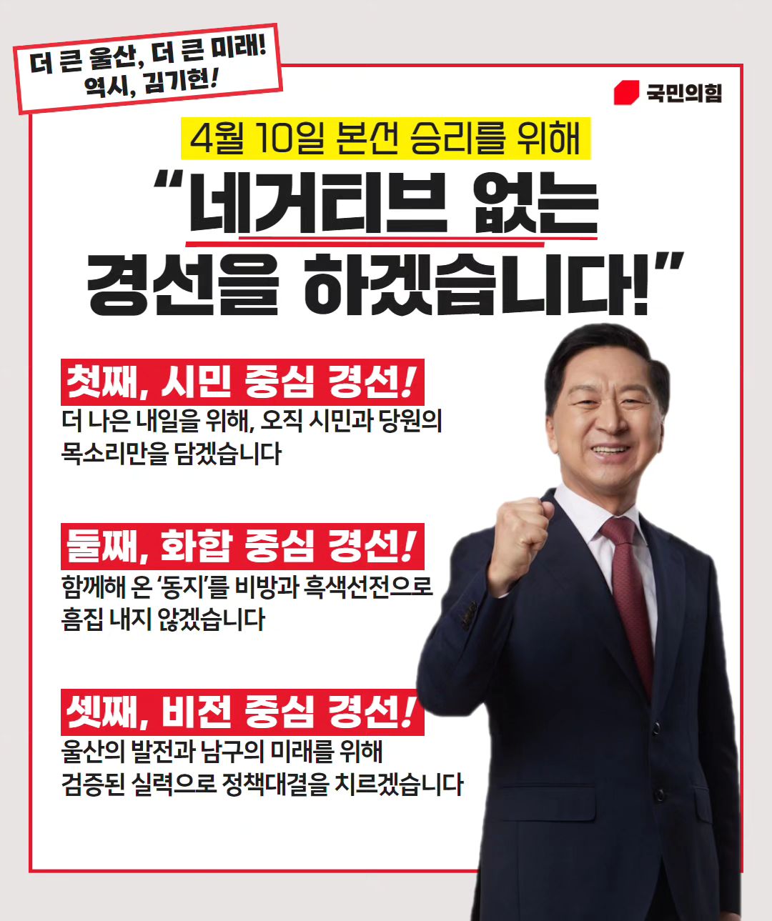 울산 남을 지역구의 정치적 상황은 복잡합니다. 이번 총선에서 울산 남을은 김기현 후보와 박맹우 전 시장의 경선이 예상되었습니다. 김기현 후보는 동일 지역구 3선 이상 국회의원 조정 지수인 15%의 감점을 받았습니다만 그는 그의 경험과 지역에 대한 애정으로 이를 극복하려고 노력하고 하였으며 실제 본선 공천권을 따냈습니다.