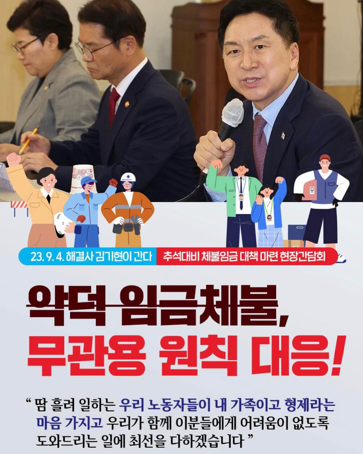 김기현 후보는 "당원 동지 여러분과 한 몸이 돼서 민생을 살려내 내년 총선 승리를 반드시 이끌어 내겠다"며 "하나로 똘똘 뭉쳐 내년 총선 압승을 이루자"고 말하였습니다3. 그는 또한 "노동개혁으로 강성 귀족노조의 특권과 반칙을 없애고, 교육개혁으로 대한민국을 인재 강국으로 키워 나가고, 연금개혁으로 온 국민이 노후 걱정 없이 안심하고 살 수 있도록 할 것"이라고 말하였습니다