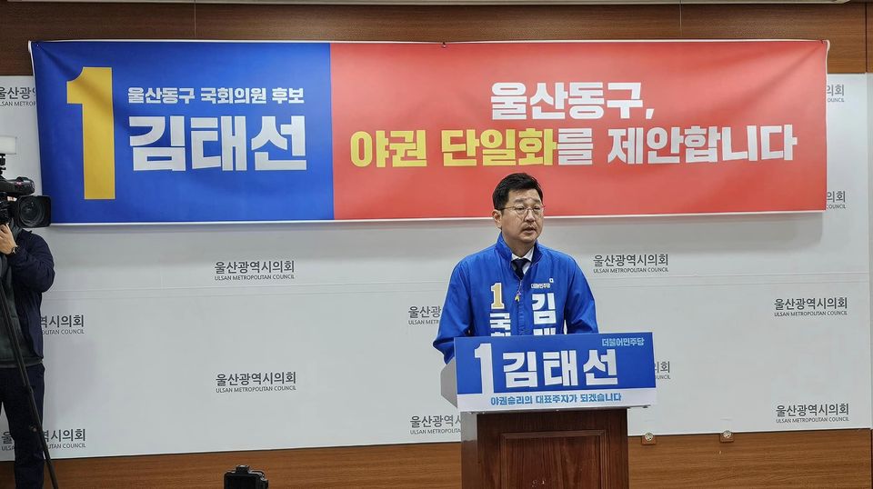 김태선 후보는 제22대 총선에 더불어민주당 울산 동구 후보로 확정되었습니다. 그는 기자회견을 통해 노동당 이장우 후보에게 울산 동구 야권 단일화를 제안하였습니다. 김태선 후보는 "지난 2월 더불어민주당, 진보당, 새진보연합은 총선 승리를 위한 후보 단일화에 합의했다"며 "세 정당의 이념과 추구하는 가치가 다르지만 윤석열 정권 심판이라는 오직 한 가지 이유로 힘을 합치기로 한 것"이라고 밝혔습니다23. 그는 또한 "절박함으로 더불어민주당은 울산 북구 무공천, 진보당은 북구를 제외한 전 지역 후보 사퇴로 하나가 되었다"며 "이제 동구만 남았다"고 강조하였습니다. 이와 함께 "이장우 후보님과 힘을 합쳐 더 큰 민심의 힘을 만들고 싶다"고 전했습니다