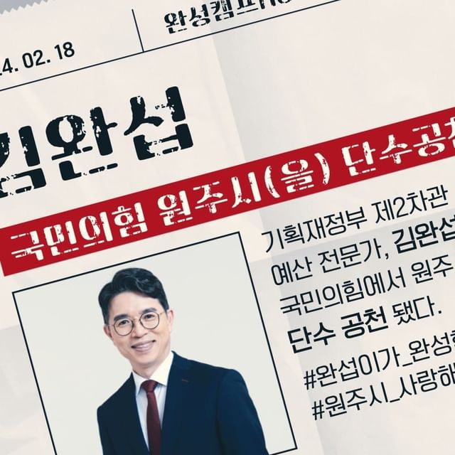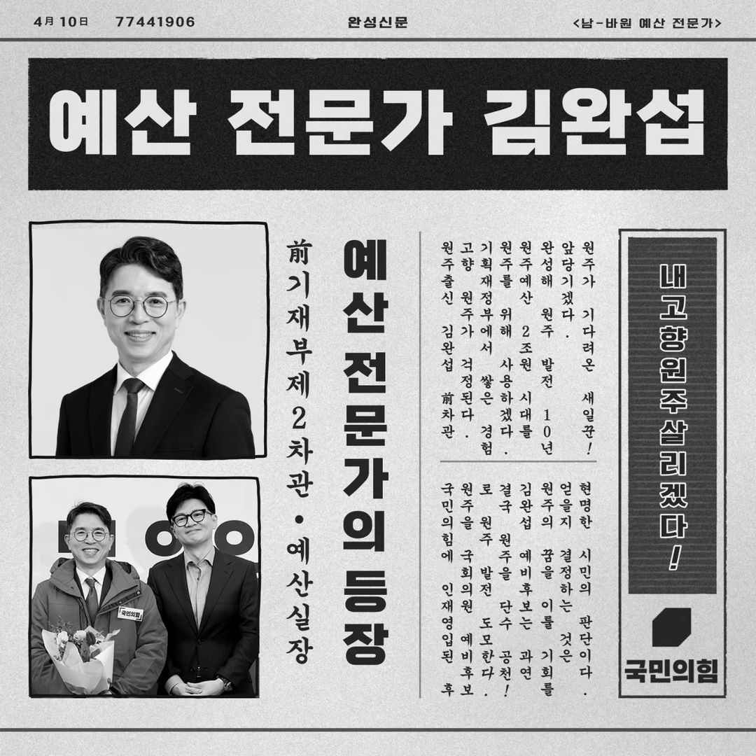 원주을 선거구에서 국민의힘 후보로 출마한 김완섭 후보는 원주시민의 행복과 원주의 지속발전을 위해 존중과 화합 그리고 상생의 정치를 약속하였습니다. 그는 "원주가 30년간 기다려온 새 일꾼"이라며, "시민들의 힘을 얻어서 번듯한 장관 한명 배출하지 못한 원주의 한을 풀어드리는 일꾼이 되겠다"고 밝혔습니다. 김 후보는 전기공유 자전거를 타고 선거운동을 하였으며3, 그의 주요 공약은 원주 예산 2조원 시대 개막, 바이오헬스·첨단의료기기·반도체 등 산학연 클러스터 적극 육성, 정주여건 개선·상권 활성화를 위한 교육 및 문화인프라 조성 등입니다.