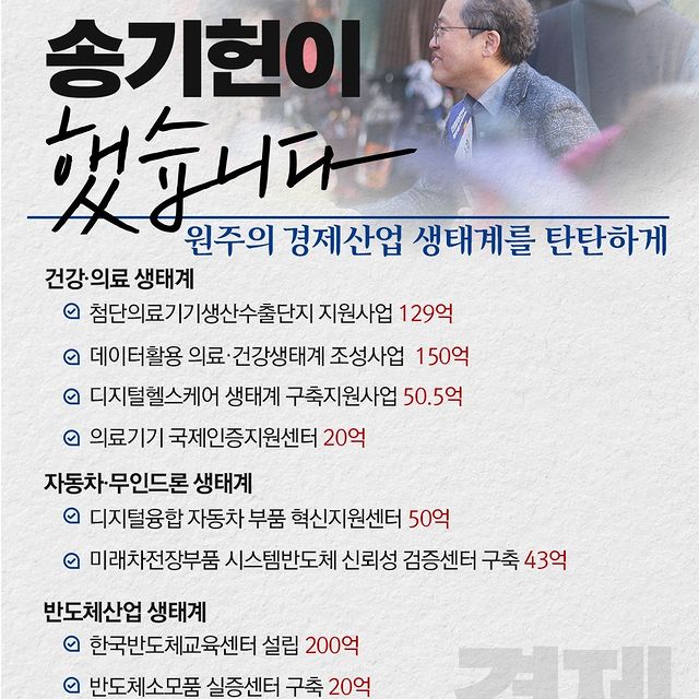 송기헌 후보는 더불어민주당 소속으로 강원 원주시을 지역구에서 3선에 도전하고 있습니다. 그는 원주시 발전을 위해 힘 있는 중진이 필요하다고 주장하며, 첨단산업 교육특구를 공약으로 내세웠습니다. 그의 주요 활동으로는 법제사법위원회에서 활동하며 국민의 법 감정과 맞지 않는 부분을 개선하려는 노력이 있습니다. 또한, 송기헌 후보는 지역 첨단산업과 연관된 대학 수업을 고등학교부터 이수하고 대학 졸업과 동시에 취업하는 지역 첨단산업 교육도 공약으로 내세웠습니다.