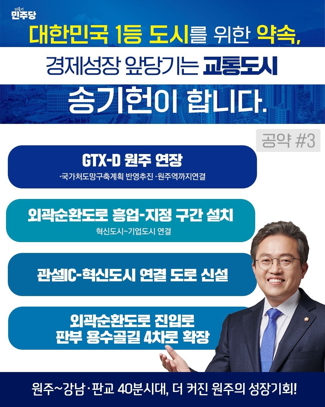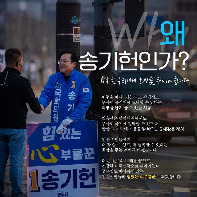 송기헌 후보는 더불어민주당 소속으로 강원 원주시을 지역구에서 3선에 도전하고 있습니다. 그는 원주시 발전을 위해 힘 있는 중진이 필요하다고 주장하며, 첨단산업 교육특구를 공약으로 내세웠습니다. 그의 주요 활동으로는 법제사법위원회에서 활동하며 국민의 법 감정과 맞지 않는 부분을 개선하려는 노력이 있습니다. 또한, 송기헌 후보는 지역 첨단산업과 연관된 대학 수업을 고등학교부터 이수하고 대학 졸업과 동시에 취업하는 지역 첨단산업 교육도 공약으로 내세웠습니다.