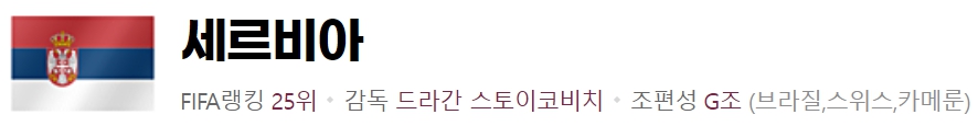 G조에서는 우선 브라질이한 자리를 찾이할 것이 분명할 것으로 보이는 상황에서 스위스, 세르비아, 카메룬 등이 한 자리를 차지할 것으로 보입니다. 세르비아 역시 유럽 예선에서 A조 1위를 차지하며 저력을 보여준 만큼 G조 역시 물고 물리는 혈전이 예상됩니다. 루키치, 그루이치, 코스티치 등이 이끄는 미드필더진과 더불어 루카 요비치, 두산 불라호비치 등이 이끄는 공격진이 뭉치면 가장 강력한 다크호스로 예상됩니다.