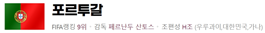 월드컵 이전 소속팀에 대한 폭탄발언으로 월드컵 자체보다 더 주목을 받은 전 맨체스터 유나이티드, 현 무소속 호날두가 이끄는 포르투갈은 호날두의 유종의 미를 기대합니다. 비르나르두 실바, 브루노 페르난데스, 후벵 네베스 등이 이끄는 탄탄한 미드필더진은 컵타이틀에 도전하기에 충분한 전력입니다.