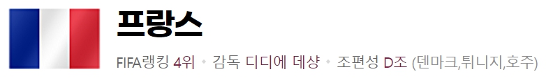 강호로 불리는 독일, 아르헨티나가 속절없이 패하는 과정에서도 이번 대회 강력한 우승 후보 중 하나인 프랑스는 첫 경기에서부터 최강의 전력을 자랑했습니다. 4골을 호주에게 퍼부은 공격력과 함께 탄탄한 수비력은 역시 이번 대회 강력한 우승후보임에 틀림없으며 이번 덴마크전 승리를 통해 16강을 조기 확정 지으려 할 것입니다.