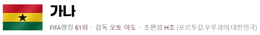 해볼 만한 상대로 평가받는 가나지만 첫 경기인 포르투칼 전에서 3실점에 2득점을 하며 엉성한 수비력과 함께 날카로운 공격력을 보여주었습니다. 첫 경기에 패한 만큼 이번 한국 전에서 승리하지 못한다면 조기에 짐을 쌀 수밖에 없기 때문에 대한민국과 마찬가지로 승부를 띄울 수 밖에 없어 뜨거운 경기가 될 전망입니다.