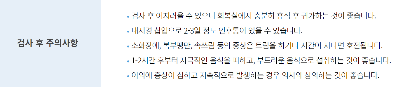검사에 앞서 몇 가지 질문을 받는 게 있으실 것입니다. 우선 혈압약이나 당뇨약을 먹는 경우 위내시경 당일 검사가 제한 될 수 있으며 이 밖에도 항혈소판제, 아스피린, 항응고제, 항우울제, 진정제, 생식 능력, /계란 알레르기, 의치 또는 느슨한 치아가 있는 경우에도 의료진에게 관련 정보를 알리고 검사 여부를 의사 판단하에 진행하도록 해야만 합니다.