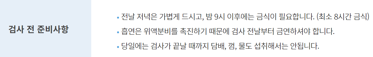 검사에 앞서 몇 가지 질문을 받는 게 있으실 것입니다. 우선 혈압약이나 당뇨약을 먹는 경우 위내시경 당일 검사가 제한 될 수 있으며 이 밖에도 항혈소판제, 아스피린, 항응고제, 항우울제, 진정제, 생식 능력, 콩/계란 알레르기, 의치 또는 느슨한 치아가 있는 경우에도 의료진에게 관련 정보를 알리고 검사 여부를 의사 판단하에 진행하도록 해야만 합니다.
