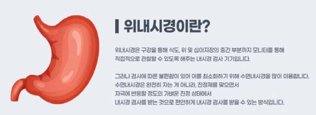 위내시경의 목적은 식도, , 십이지장 질환(식도염, 위염, 궤양, , 용종)을 진단하는 것인데 최근에는 수면 유도제를 통한 수면 내시경을 주로 선택하는 경우가 많지만 비수면 상태에서도 검진이 가능합니다. 내시경을 하는 과정에서 드물게 기침, 인후통, 검사 부위 출혈, 혈변, 복통, 입술 및 치아 손상, 현기증, 숨가쁨, 혈압 변화, 저산소증, 빈맥 등의 합병증이 발생할 수 있지만 생명을 위협할 정도는 아니지만 약물에 의한 과민 반응 시에는 응급 치료가 필요할 수 있습니다.