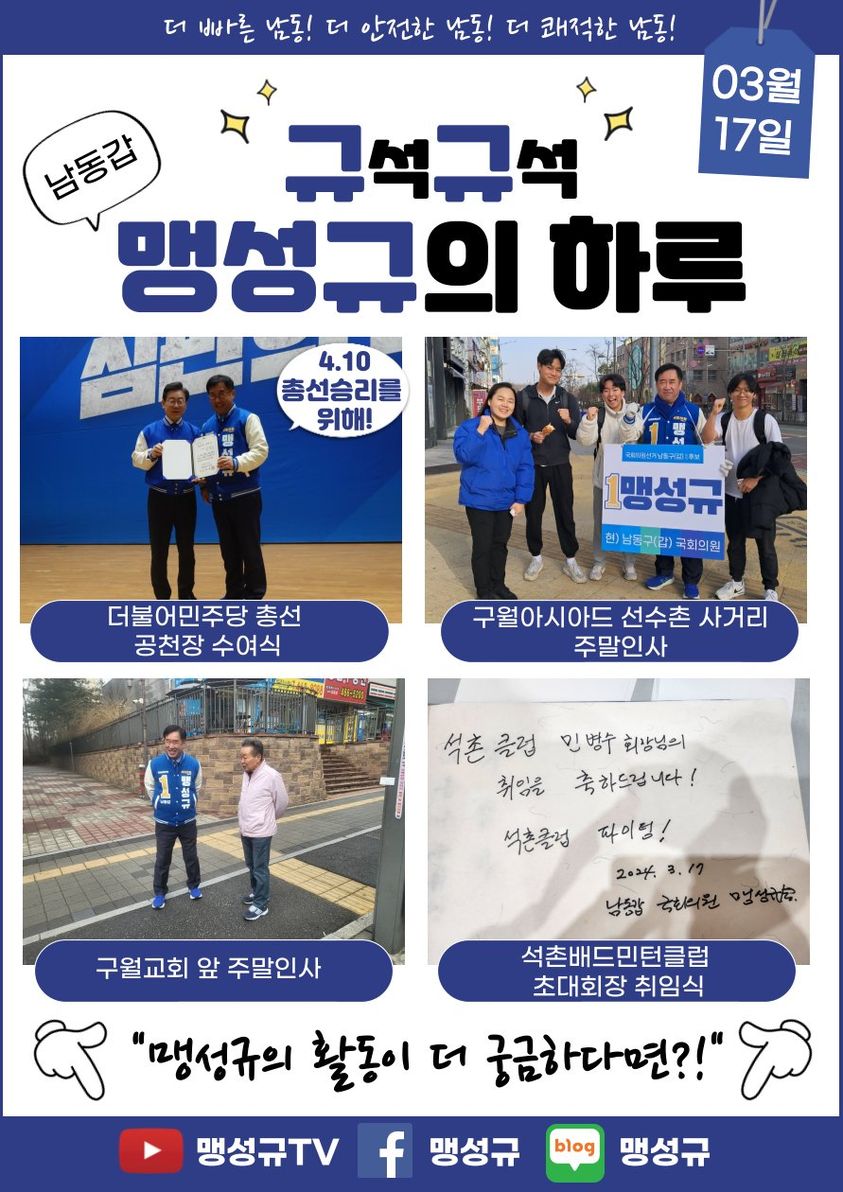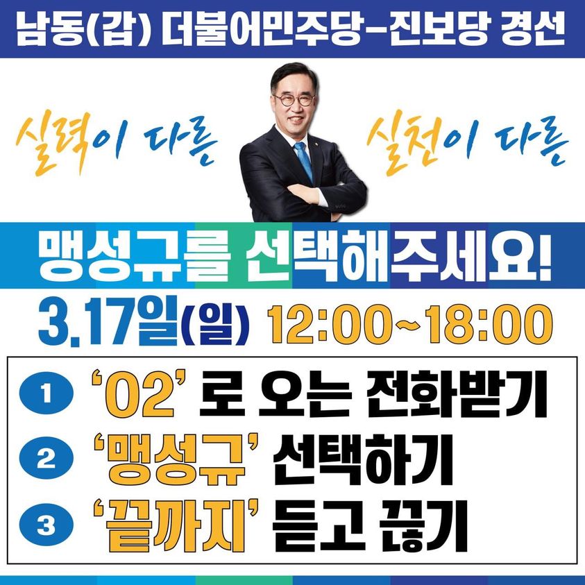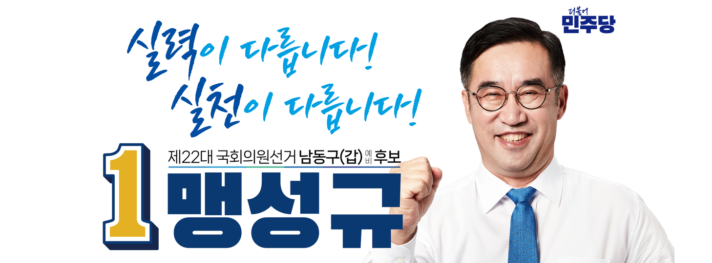 더불어민주당의 맹성규 후보는 인천 남동구갑에서 국회의원으로 활동하고 있습니다. 그는 이번 총선이 국민을 무시하고 민생을 외면하는 윤석열 정권을 심판하는 선거라고 주장하였습니다2. 그는 이번 선거를 통해 국민의 의지를 나타내는 계기가 될 것이라고 밝혔습니다. 맹성규 후보는 전세사기, 순살아파트 등 민생문제 해결에 주력하겠다고 전했습니다. 그는 이러한 문제들을 해결하기 위해 국회에서 전세사기특별법 통과를 주도하였습니다. 또한, LH 부실시공 아파트 피해자 보상이 원만히 이뤄질 수 있도록 앞장서 왔습니다 맹성규 후보는 국민의힘 소속으로 출마를 예정하는 예비후보 4명과 가상대결에서 모두 앞선다는 결과가 나왔습니다4. 이는 그가 지역구에서 강력한 지지를 받고 있음을 보여줍니다.
