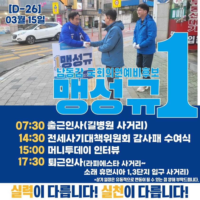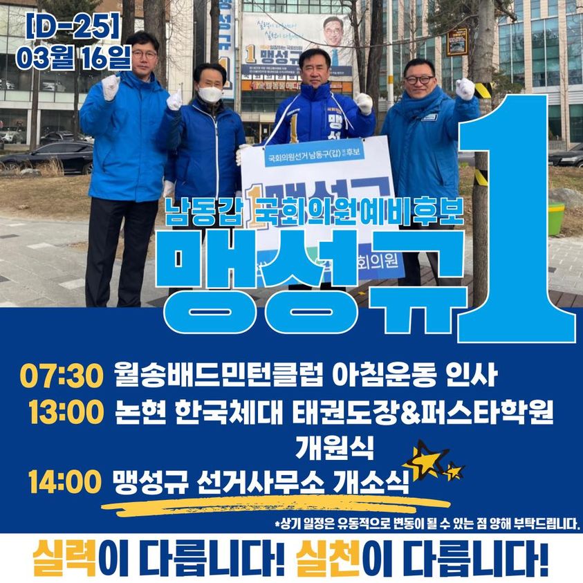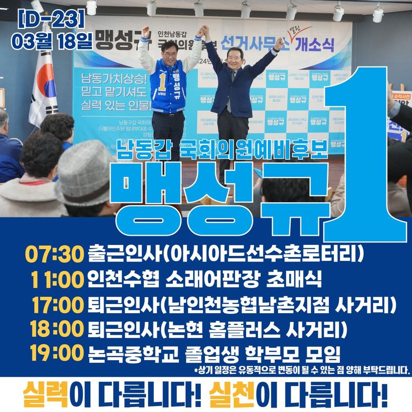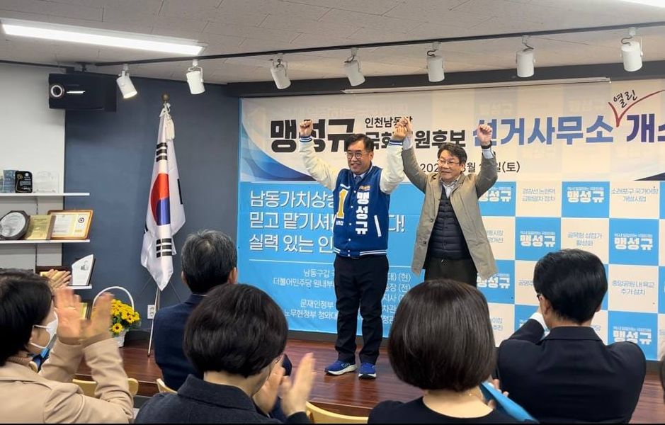 또한, 최근 여론조사에서 민주당은 38.0%, 국민의힘은 36.8%로, 민주당과 국민의힘이 오차범위 내에서 초접전을 벌이고 있는 것으로 나타났습니다. 이러한 상황은 맹성규 후보가 지역구에서 강력한 지지를 받고 있음을 보여줍니다. 맹성규 후보는 지역구민들과의 소통을 위해 다양한 행사에 참여하고 있습니다. 그는 최근에 남동구 공인중개사협회 임·직원들과 함께 부동산 공정거래질서 확립을 위한 민생간담회를 개최하였습니다. 이외에도, 맹성규 후보는 설 명절을 맞아 시장 방문 등 다양한 민생 행보를 펼치고 있습니다.