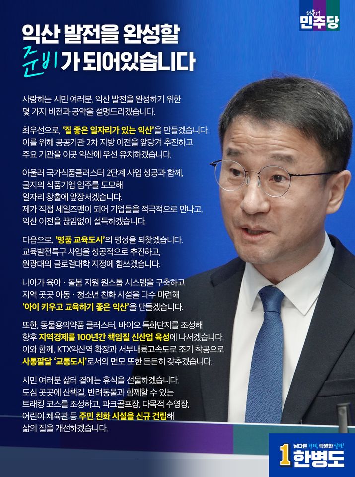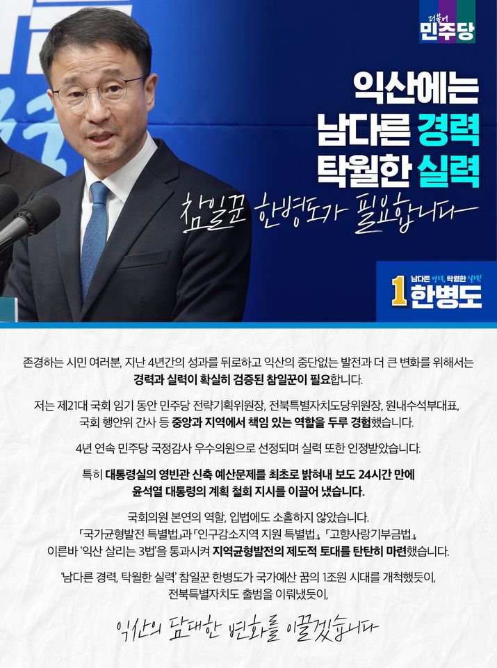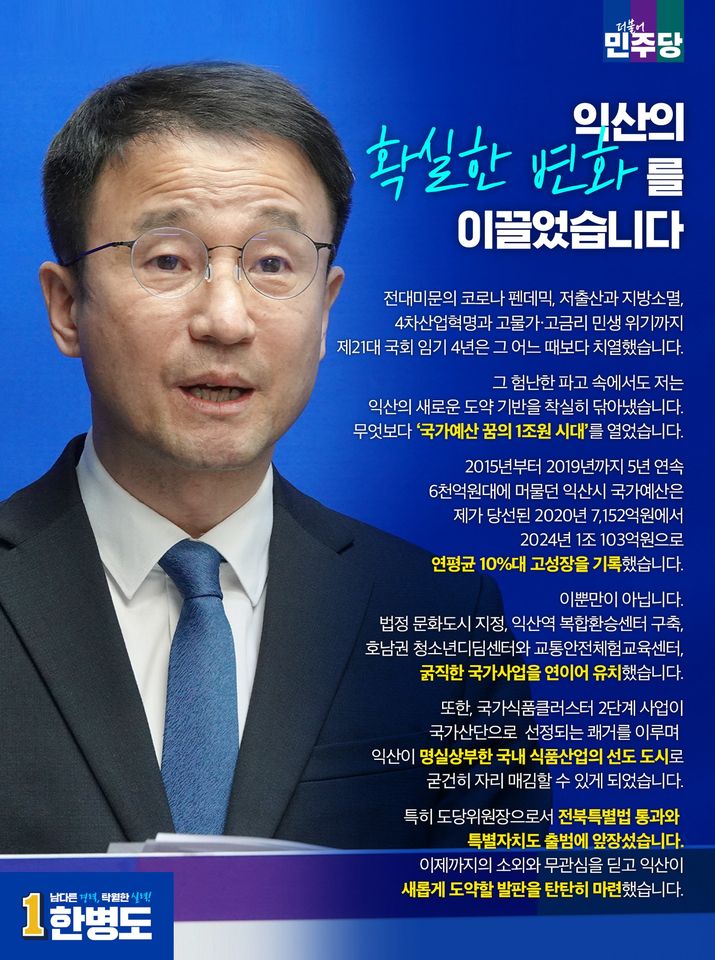 더불어민주당 한병도 후보는 전북 익산시을 지역구에서 활동하고 있습니다. 그는 2020년 2월 29일에 더불어민주당 익산시을 공천을 확정받았습니다. 한병도 후보는 현재 더불어민주당내 전략기획위원장으로, 총선기획단에서 내년 총선 전략을 책임지고 있습니다3. 그는 제1정책조정위원회 위원장, 행정안전위원회 간사, 대통령실 의혹 진상규명단장, 예결위 예결소위, 기재위 조세소위 위원 등을 맡아 국회 내에서 활동하였습니다.