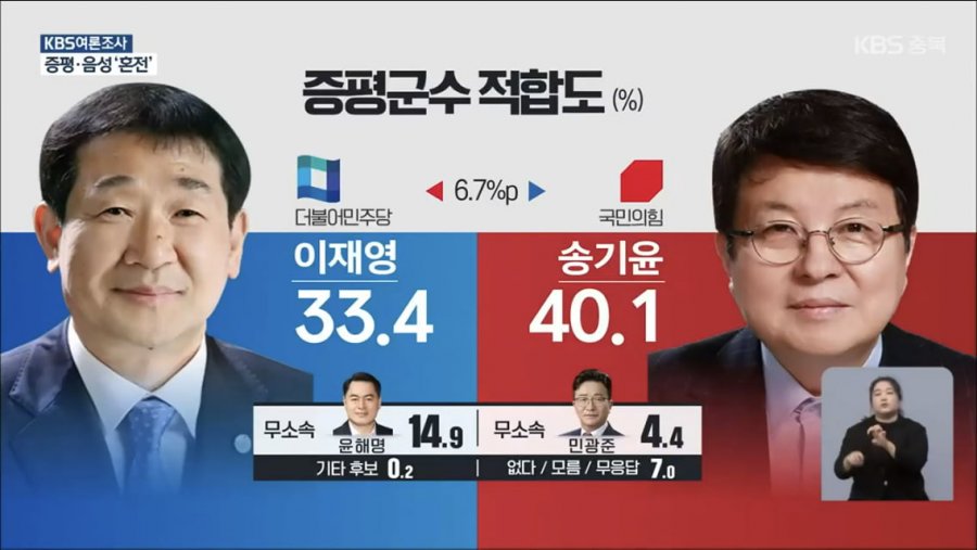 증평군수 선거에는 컷오프 등으로 반발도 일부 있어 무소속 후보들도 꽤 있는 데 우선 민광준 전 증평군 경제개발국장과 무소속 윤행명 증평군재향군인회장입니다. 하지만 이번 여론조사에서는 연기자출신 정치인으로 관심을 끌고 있는 국민의힘 송기윤 후보가 40.1%, 더불어민주당 이재영 후보가 33.4%, 윤해명 14.9%, 민광준 4.4%로 나타나 국민의힘 송기윤 후보가 가장 앞서고 있는 것으로 나타나 4자 대결 상황에서 어떤 변화가 있는지에 따라 선거결과가 요동칠 것으로 보입니다. 남은 선거 기간 중 이슈 대응과 이에 따른 여론 변화도 지켜봐야 할 것으로 보입니다.