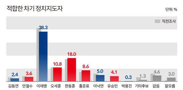 유승민 전 의원은 지난 조사까지는 명단에 오르지 않았는데 이번 이태원 참사 사건에 대하여 현 정부를 강하게 비판하면서 오히려 야권의 지지층을 흡수하면서 차기 지도자 지지율에 순위를 올렸다는 평이 있으며 안철수 의원은 오히려 국민의힘에서 힘을 받지 못하는 것 같아 안타까움을 더합니다.