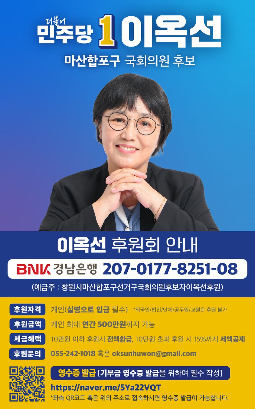 이옥선 후보는 2024년 2월 20일에 경남도의회에서 기자회견을 열고 "더 이상 마산은 부분 교정으로는 바꿀 수 없다"며 "중앙에서 지방을 살리는 정책을 요구하고 지역에서 정치 불신과 민생 어려움을 해결하겠다"고 밝혔습니다4. 그는 2006년 마산시의원으로 정치 입문한 약사 출신으로, 창원시의원 재선을 거쳐 2018년 경남도의원에 당선해 지방의정 경험을 쌓았습니다4. 그는 △지방비와 국비 비율 동일화 △공공의료 강화 △사회복지사·요양보호사 처우 개선 △전세사기·보이스피싱·대출사기 등 가중처벌 특별법 제정 △마산해양신도시·마창대교·마산로봇랜드 등 지역현안 해결을 공약했습니다.