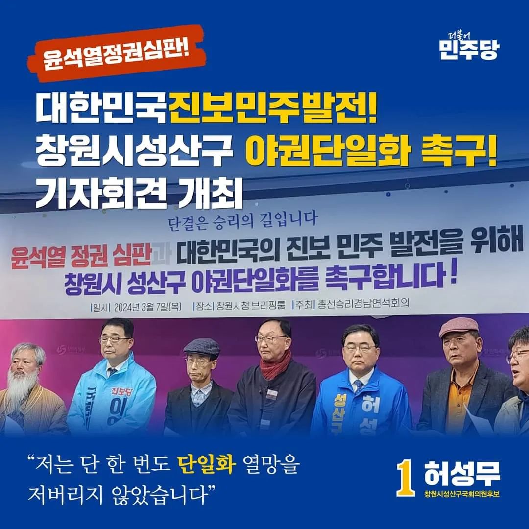허성무 후보는 대한민국을 완전히 새롭게 바꾸기 위한 통합의 큰 정치를 주장하였습니다3. 그는 범민주진보세력 단일화로 반드시 총선에서 승리하겠다는 입장을 밝혔습니다. 아울러 허성무 후보는 지역의 정당, 정파 간에 논의와 토론을 통해 대안을 모색하는 협의체를 만들겠다고 말하였습니다허성무 후보는 지구당 부활을 통한 지역민의 의견수렴과 대변이 필요하다고 주장하였습니다 . 허성무 후보는 ICT, IoT, AI가 융합한 세계 1등 첨단 제조업 도시 창원을 만들어, 세계 최고의 경쟁력을 갖춘 국제도시 창원을 설계하는 일에 모든 역량을 쏟겠다는 의지를 내비쳤습니다. 뿐만 아니라, 이번 총선을 윤석열 정권 심판으로 규정하며 야권 후보 단일화를 강조하였습니다.