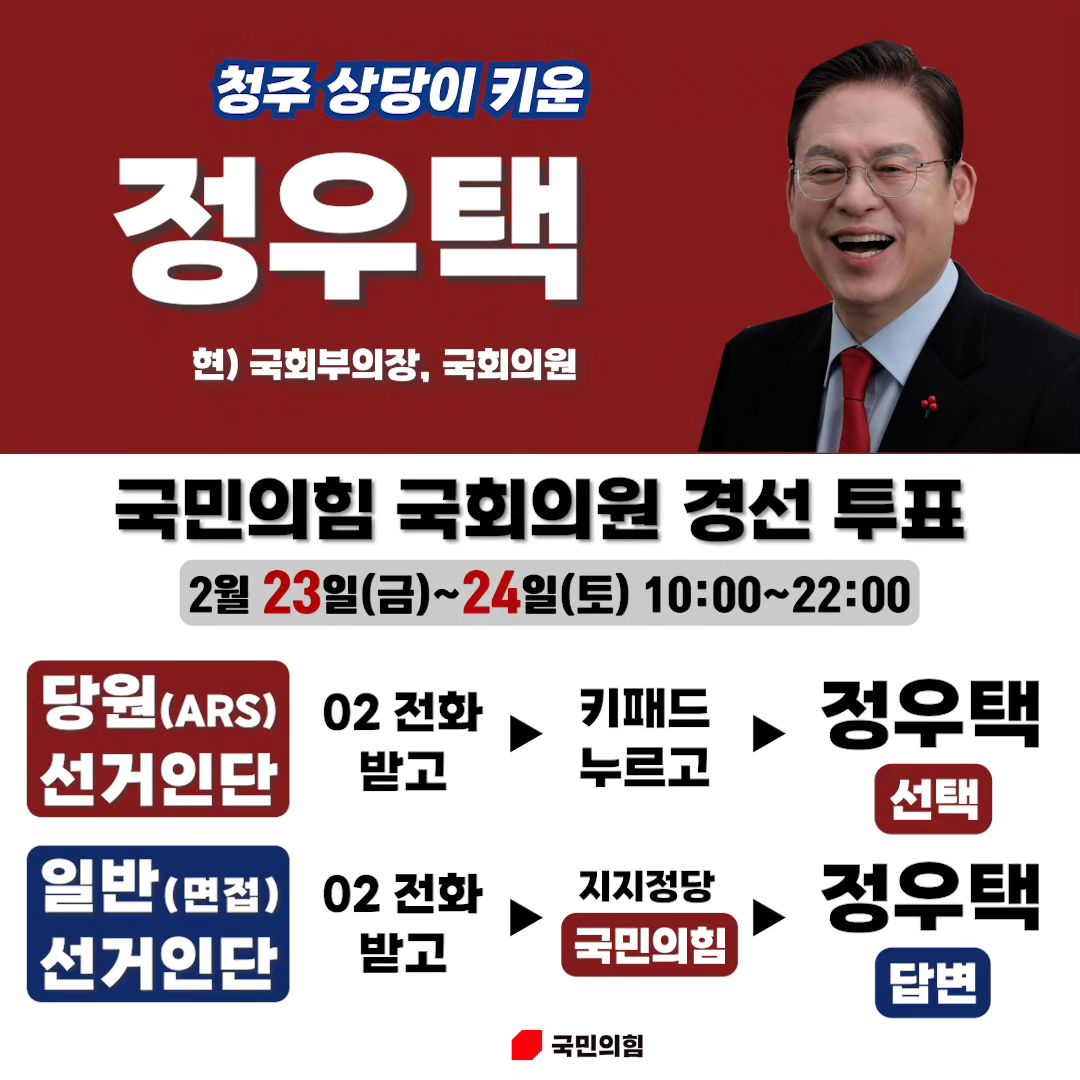 또한, 정우택 후보는 "이번 총선을 통해 윤석열 정부의 성공과 민주당의 그간의 입법 독재, 방탄 횡포를 막을 수 있는 새로운 민생을 위한 국회가 구성돼야 한다"며 "본선에서 겨룰 민주당 후보가 아직 결정되지 않았지만, 여기에서 압승을 거둬 청주는 물론이고 충북·충청 전역에서 압승을 거둬 새로운 대한민국을 창조하는데 우리 청주상당이 그 첨병으로서의 역할을 할 수 있도록 최선을 다하겠다"고 다짐하였습니다.