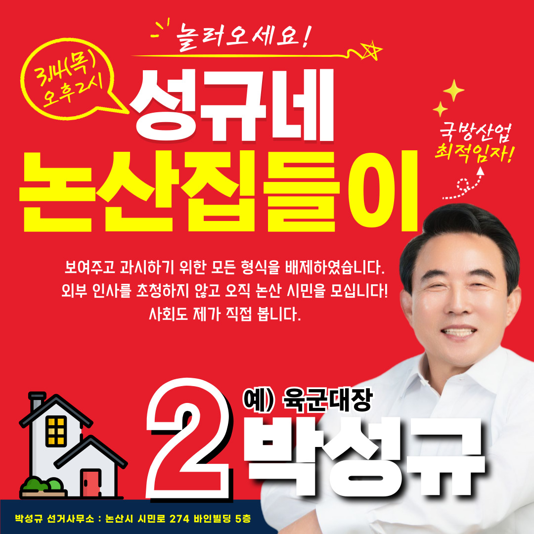 그의 주요 활동으로는 국방전문가로서 지역주민에게 희망을 안겨주는 국방군수산업도시 조성과 농업 세계화 정책을 중심으로 공약을 심도 있게 고민하고 있다고 밝혔습니다. 그는 또한 돌봄과 생활 인프라를 확충하고 지방의 교육환경을 혁신하여 이웃과 함께 풍요로운 미래를 꿈꾸는 현실정치에 참여하고자 한다고 강조하였습니다. 박성규 후보는 더불어민주당에서 단수 공천한 황명선 예비후보와 맞대결을 펼치게 되었습니다. 그는 국방도시에는 국방전문가가 필요하다며 국방산업특화클러스터를 조성해 논산·계룡·금산에 활력을 불어넣겠다고 주장하였습니다.