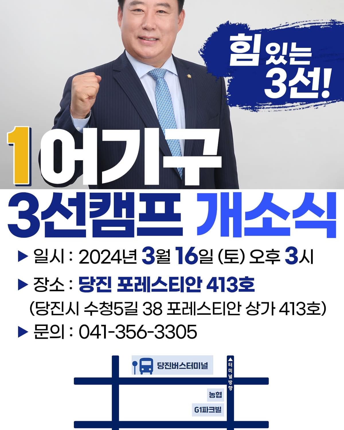 어기구 후보는 2024년 3월 6일에 "이제 당진도 힘 있는 3선 중진의원이 필요하다"고 밝혔습니다. 그는 지난 8년간 '현장에 답이 있다’는 의정 철학을 가지고 시민들 작은 목소리도 크게 듣기 위해 노력했다고 말했습니다. 그는 특히 "재선 8년간 당과 국회에서 주요 보직을 두루 경험하면서 정치력과 전문성을 겸비했다"며 "한국매니페스토실천본부가 발표한 공약 완료율 77.6%, NGO 단체로 구성된 법률소비자연맹이 발표한 21대 국회 의정활동 평가에서 충남 의원 가운데 1위가 말해주듯 능력과 실천력을 검증받았다"고 강조했습니다.