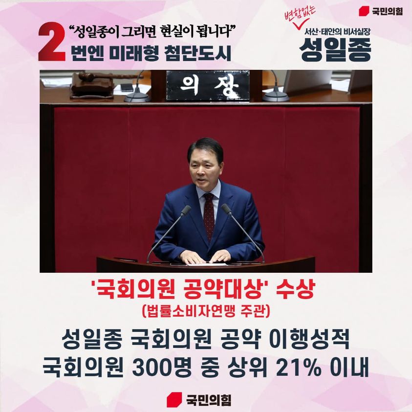 성일종 후보는 국민의 눈높이에 맞춘 약자를 위한 입법을 강조하며, 지역구 의원으로서 서산·태안을 대표한다는 책임감을 가지고 의정활동에 최선을 다하겠다고 밝혔습니다. 그는 "정치의 본질은 권력의 균형을 맞추는 것"이라며 "약자와 강자, 있는 자와 없는 자 사이의 균형을 맞추어, 공동체 전체의 이익을 위해 사용되어야 한다"고 주장하였습니다.