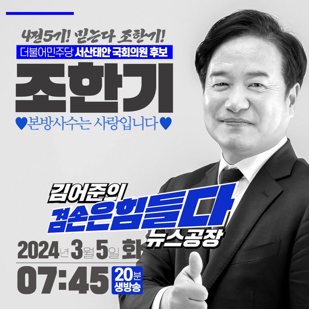 조한기 후보는 강력한 국가균형발전 추진, 서산을 더 강력한 첨단 산업도시로 육성, 태안에 첨단 산업의 씨앗을 뿌리고 관광산업을 고도화, 농어촌을 살려 지역소멸을 막겠다는 주요 공약을 발표하였습니다. 그의 경력에는 국회의원 보좌관, 장관 보좌관, 국무총리 의전비서관, 청와대 의전비서관 등이 있습니다. 이런 경력을 가진 그를 지역민들이 써 봐주시면 어떨까, 기회를 한번 달라고 호소하였습니다.