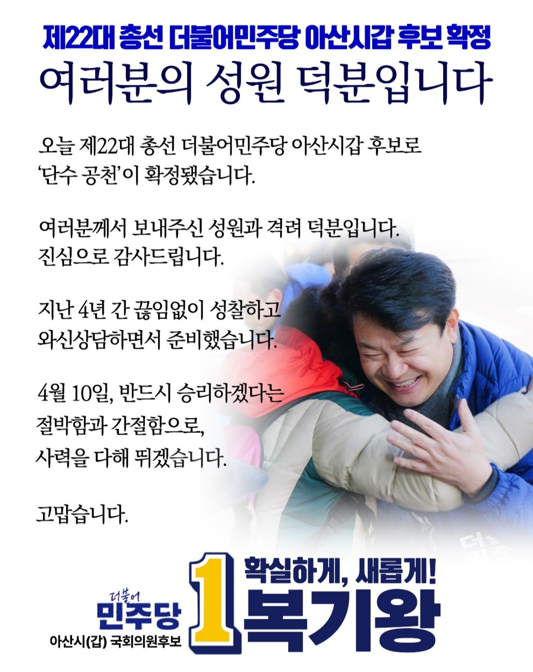 복기왕 후보는 더불어민주당 아산시갑 선거구 제22대 총선주자로 확정되었습니다. 그는 이번 총선이 정부에 국민이 살아있다는 것을 보여주고 민생파탄을 다시 회복시킬 수 있는 날이어야 한다고 강조하였습니다1. 그의 주요 공약으로는 국립경찰병원 아산병원 조기 건립, GTX-C노선 아산 연장, 아산세무서 원도심 유치 등을 제시하였습니다.