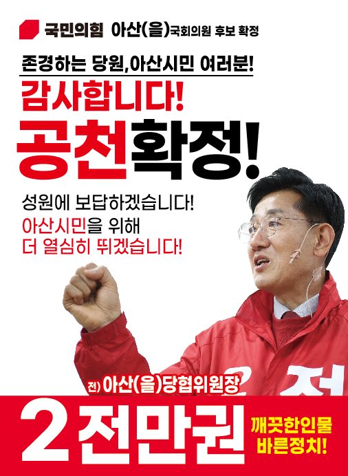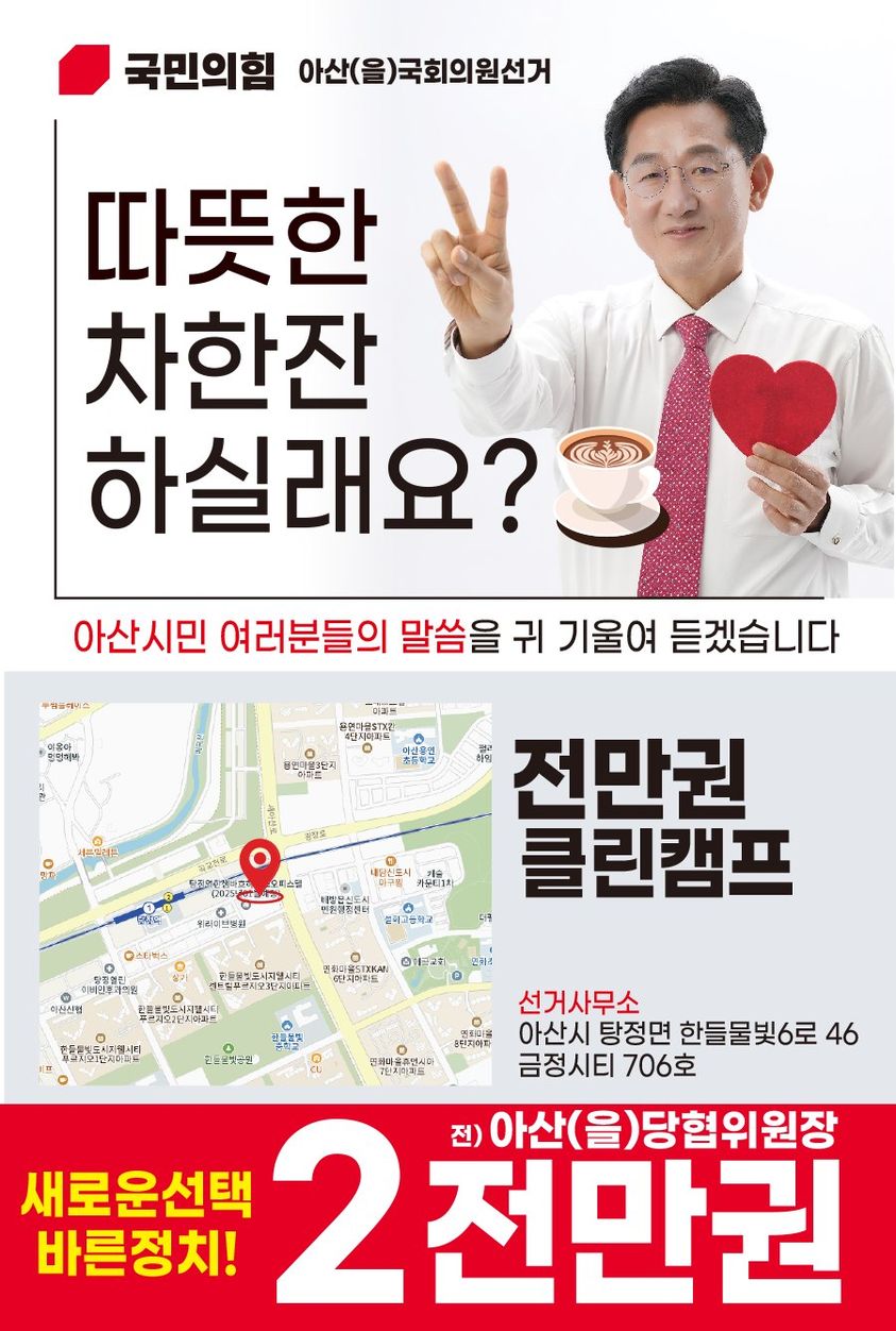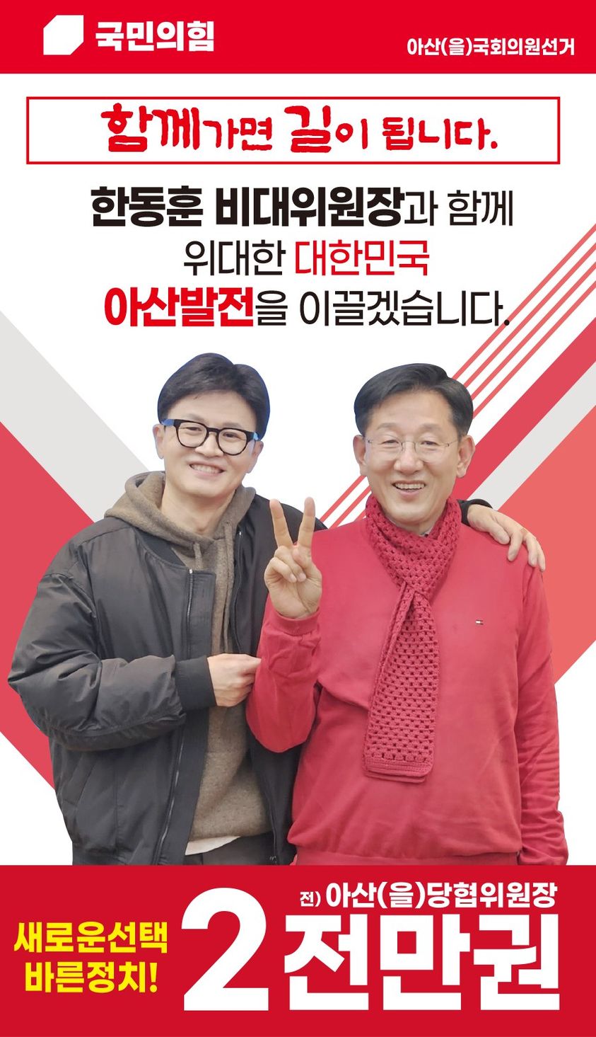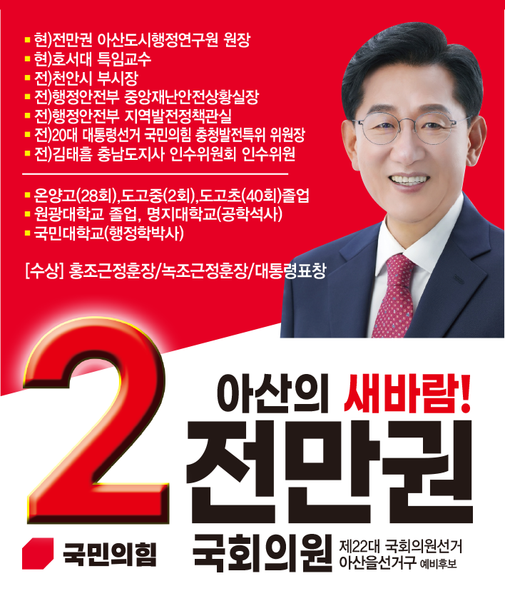 전만권 후보는 국민의힘 아산을 당협위원장으로서의 역할을 마다하지 않겠다는 입장을 밝혔습니다. 그는 "국회의원은 국가사무를 관리·감독하고, 대한민국의 미래를 제시하는 역할"이라며 "30년 행정경험으로 쌓은 비전과 노하우를 의정활동에 녹여내겠다"고 강조하였습니다 전 후보는 지역 현안에 대해 "삼성 등 대기업만 빼면 즉시 지역소멸에 빠질 수 있다"며 "지역산업 대전환을 이룰 준비가 필요하다. 기존 정치관습에 매몰된 의정활동 시각을 바꾸겠다"고 강조하였습니다.