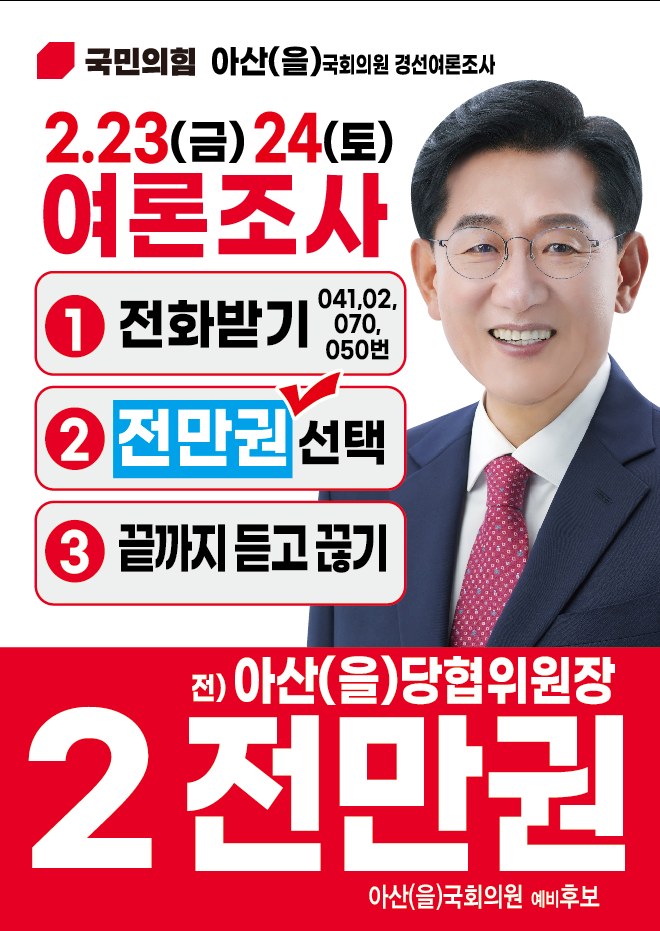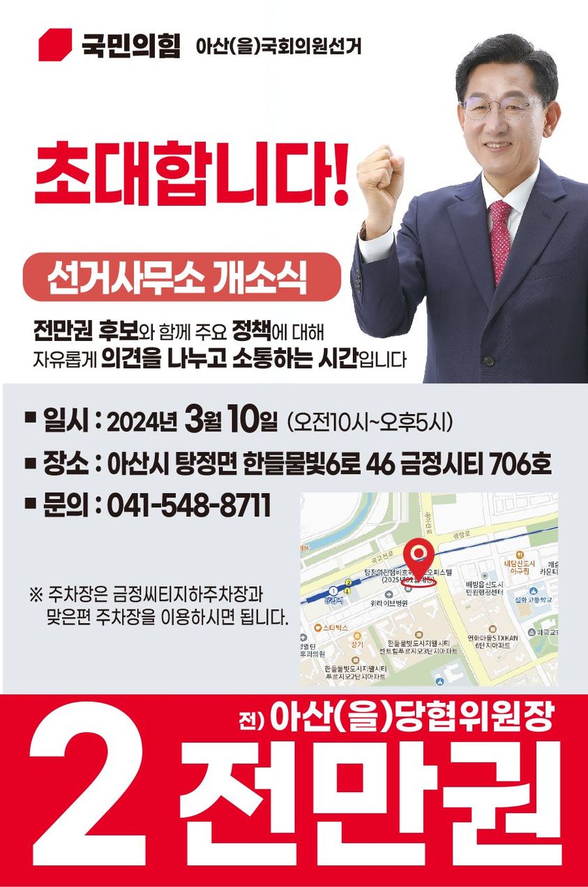 전만권 후보는 국민의힘 아산을 당협위원장으로서의 역할을 마다하지 않겠다는 입장을 밝혔습니다. 그는 "국회의원은 국가사무를 관리·감독하고, 대한민국의 미래를 제시하는 역할"이라며 "30년 행정경험으로 쌓은 비전과 노하우를 의정활동에 녹여내겠다"고 강조하였습니다 전 후보는 지역 현안에 대해 "삼성 등 대기업만 빼면 즉시 지역소멸에 빠질 수 있다"며 "지역산업 대전환을 이룰 준비가 필요하다. 기존 정치관습에 매몰된 의정활동 시각을 바꾸겠다"고 강조하였습니다.