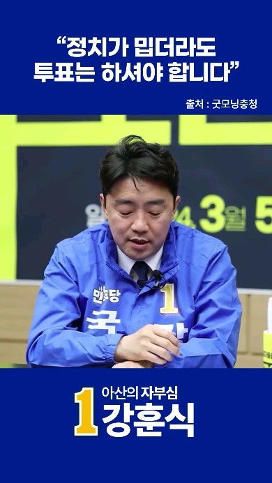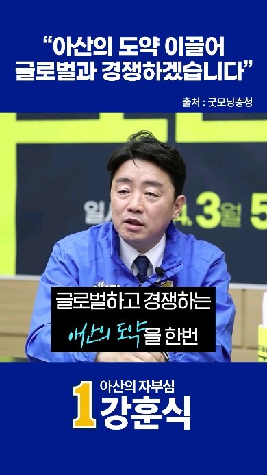 강훈식 후보는 더불어민주당 아산시을 선거구 제22대 총선주자로 확정되었습니다. 그는 이번 총선이 정부에 국민이 살아있다는 것을 보여주고 민생파탄을 다시 회복시킬 수 있는 날이어야 한다고 강조하였습니다. 그의 정치적 입장은 민생 우선 정치를 실현하겠다는 것입니다. 그는 이번 선거를 통해 윤석열 정권의 무능함과 오만함을 반드시 심판하겠다고 밝혔습니다. 그는 또한 30여년 정치인생을 마지막으로 불태우는 도전이 대한민국을 바꾸고, 당리당략과 사리사욕에 눈먼 정치판을 바꾸고, 지역 발전을 끌어낼 수 있는 멋진 승리의 도전이 되길 간절히 원한다고 지지를 호소하였습니다2. 이로써 강훈식 후보의 총선 도전 성공여부에 많은 관심이 쏠리고 있습니다.