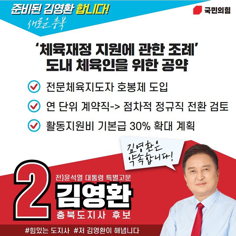 김영환 충북도지사 당선인은 주요 공약들을 발표하였는데 우선 공공 와이파이 사업입니다. 충북형 공공wifi사업을 통하여 충북 대표관광지 상가 밀집지역에 공급하여 메타버스 명품관광을 실현시킴과 동시에 메타버스 이벤트를 진행하겠다고 밝혔습니다. 또한 체육재정 지원에 관한 조례를 통하여 전문 체육지도자 호봉제 도입을, 소상공인진흥원과 소상공인정책과 신설하여 소상공인을 지원하고 청주 1구 1소방서 구축과 한국소방안전원 유치 기업하기 좋은 충북을 모토로 충북창업펀드 조성하여 일자리 창출 메카로 문화예술 분야 예산을 확대하여 충북 문화예술 진흥을 하여 충북을 발전시키겠다는 포부를 내세웠습니다.