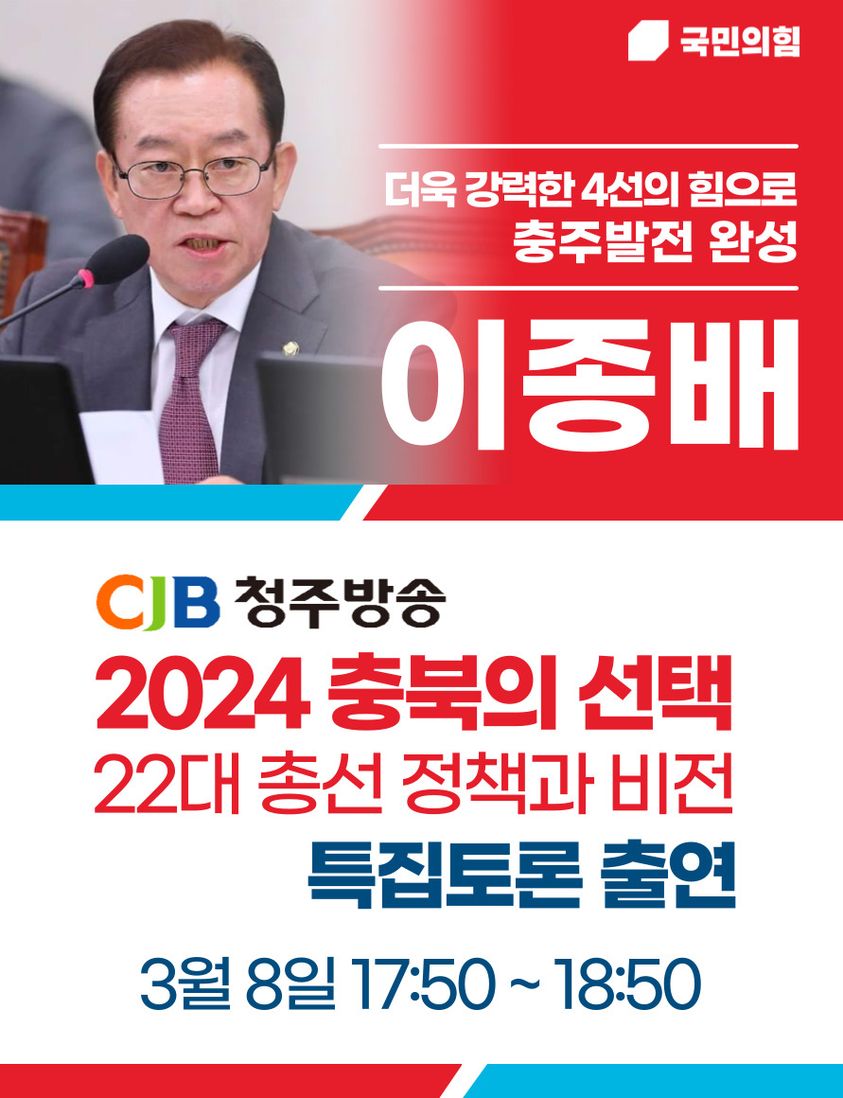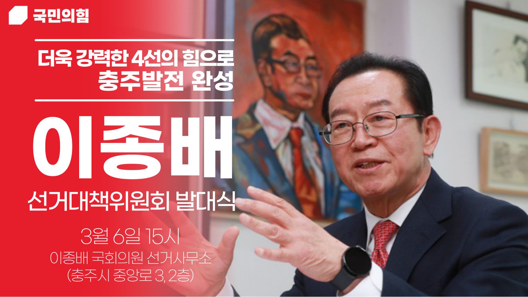 국민의힘 이종배 의원은 2024년 22대 총선에서 충북 충주 지역구 후보로 확정되었습니다. 이 의원은 "더욱 강력한 4선의 힘으로, 윤석열 정부 성공과 충북 충주 발전 완성을 위해 최선을 다하겠다"고 밝혔습니다. 이 의원은 충북도 행정부지사, 행정안전부 차관, 충주시장 등 중앙과 지방의 요직을 두루 거쳤으며, 전문성과 성실성을 인정받아 21대 국회에서도 국민의힘 초대 정책위의장, 국회 예산결산특별위원회 위원장, 국민의힘 충북도당위원장을 맡는 등 중앙과 지역에서 두루 활약했습니다.