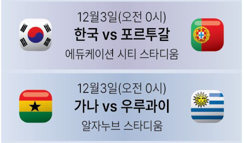 1, 2차전을 성공리에 가져갔다면 3차전의 부담을 다소나마 덜 수 있지만 우리나라 전력상 1차전, 2차전 모두 쉬운 경기를 가져가기 어려울 것으로 예상되기 때문에 우리 조의 시드국인 포르투갈과의 경기는 상당한 부담감으로 작용할 것으로 보입니다. 이러한 부담감과는 달리 경기시간은 금요일에서 토요일로 넘어가는 12월 3일 토요일 00시에 열린다는 점은 시청하기에 더할 나위 없이 좋은 시간대로 보입니다.