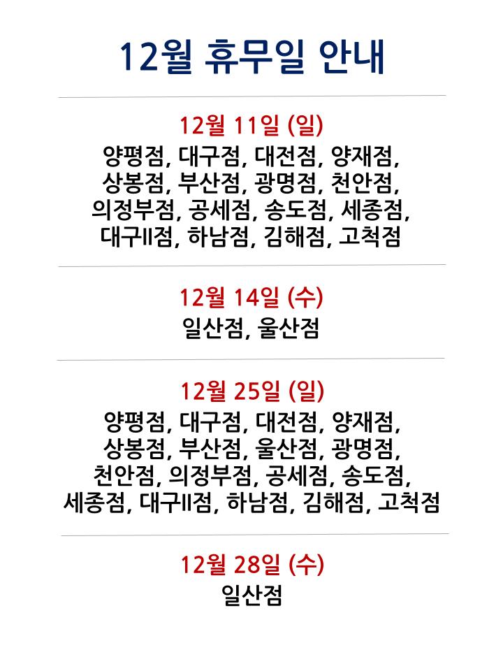 우리나라 대형마트들은 대부분 의무휴업일이 적용되는 사업장으로 법상 휴무일은 매월 둘째, 넷째 일이욜이지만 지역별로 실제 휴무일은 각 지자체별 조례로 별도로 정하고 있어 차이가 있어 다소 혼란스러울 때가 많습니다. 해서 이번 시간에는 2022년 12월 코스트코 휴무일을 알아보겠습니다.